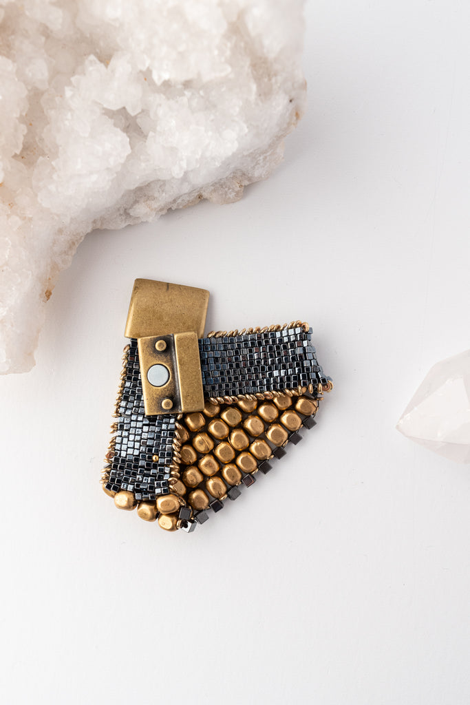 Bold and sculptural, this statement bracelet showcases rows of hand-woven 18k gold–plated brass cubes paired with glossy hematite accents. The dimensional pattern creates a luxe, architectural feel with beautiful movement on the wrist. Finished with a magnetic clasp for easy wear, it’s a striking piece that instantly elevates any look.