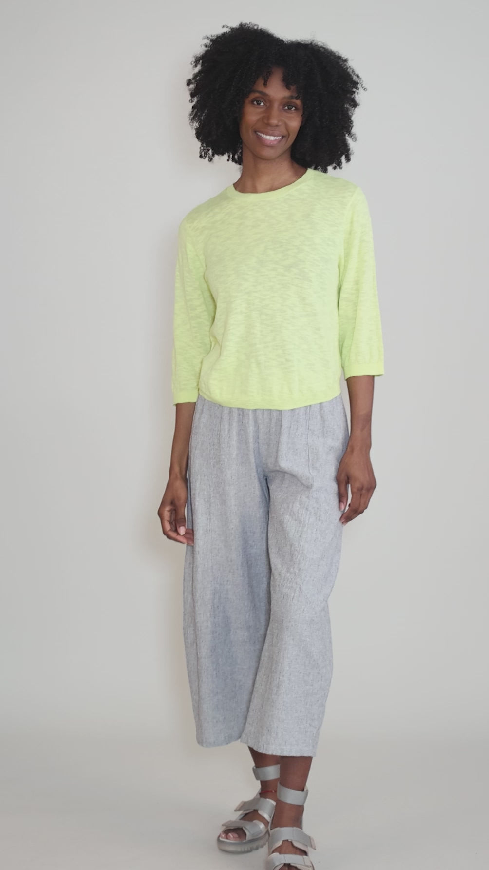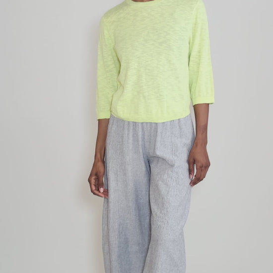 Done in a very sophisticated, very fine slub cotton sweater knit, this trim tee has a crew neckline, long sleeves and a deliberately boxy silhouette. The length is slightly cropped, making this an elegant partner to higher-waisted pants and skirts.