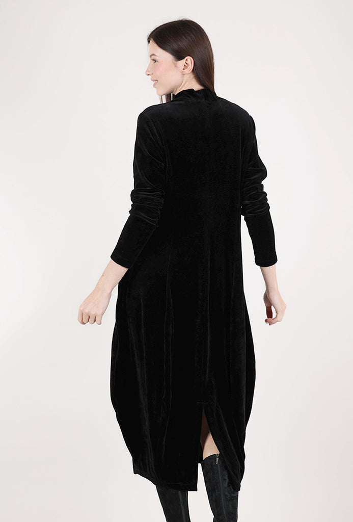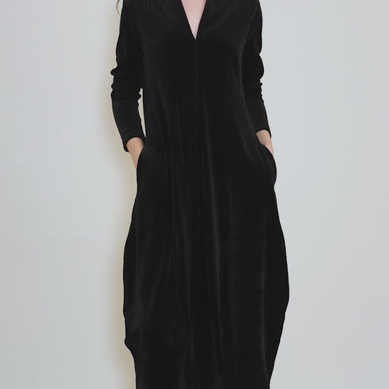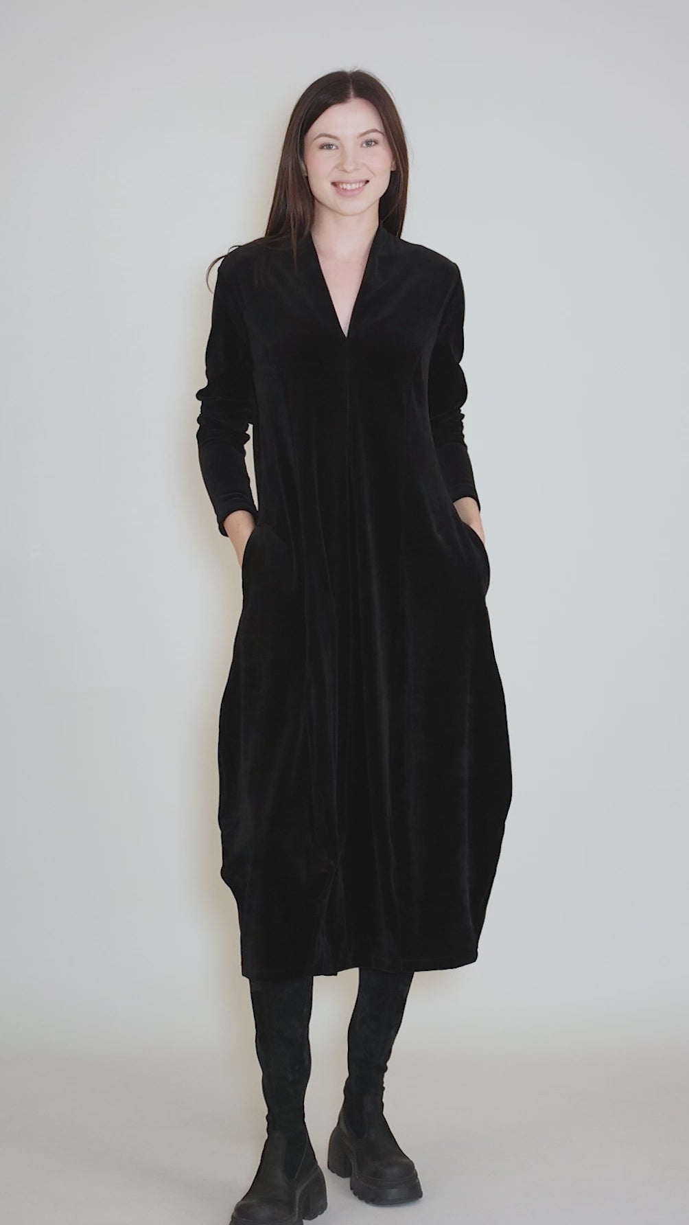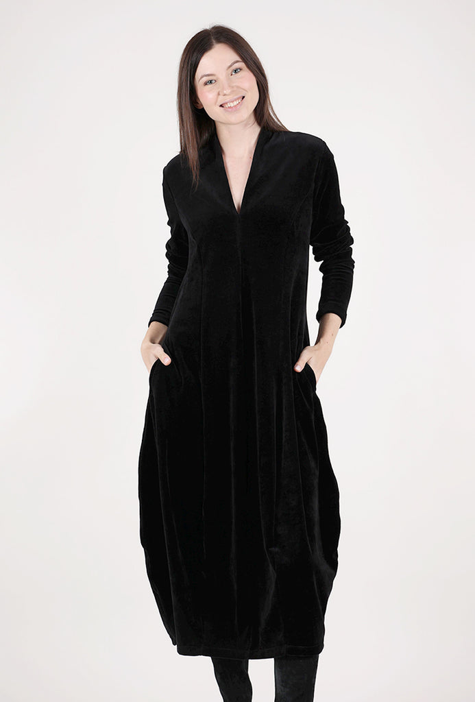 This dress has the classic Alembika lantern silhouette, beloved by our in-store customers for its flattering fit. Addie has a deep V neckline with a short collar, long sleeves and a slim fit through the bodice before falling into a full lantern shape ending at mid-calf; slit pockets sit on the hips. The fabric here is rather luscious, a rich cotton velour, perfect for colder-weather events.