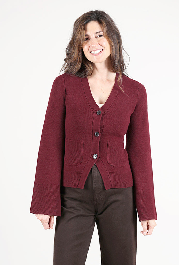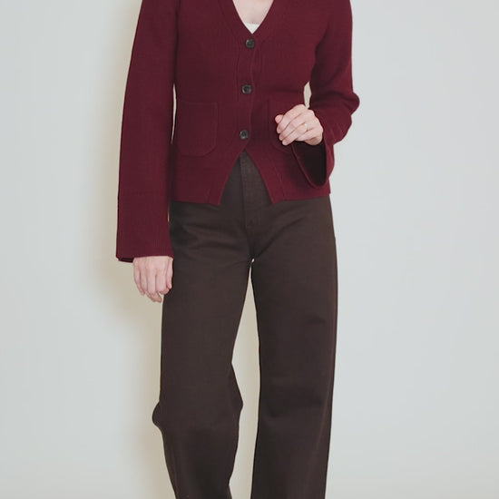 Aeron marries the ease of a sweater with the structure of a blazer. Crafted in a substantial, soft blend of cotton, wool and cashmere, the sweater has a V neckline, with long sleeves that bell at the wrists; the knit is ribbed through the deep cuffs and waistline for a figure-conscious fit-and-flare silhouette. Running true to size to a bit snug through the waist.