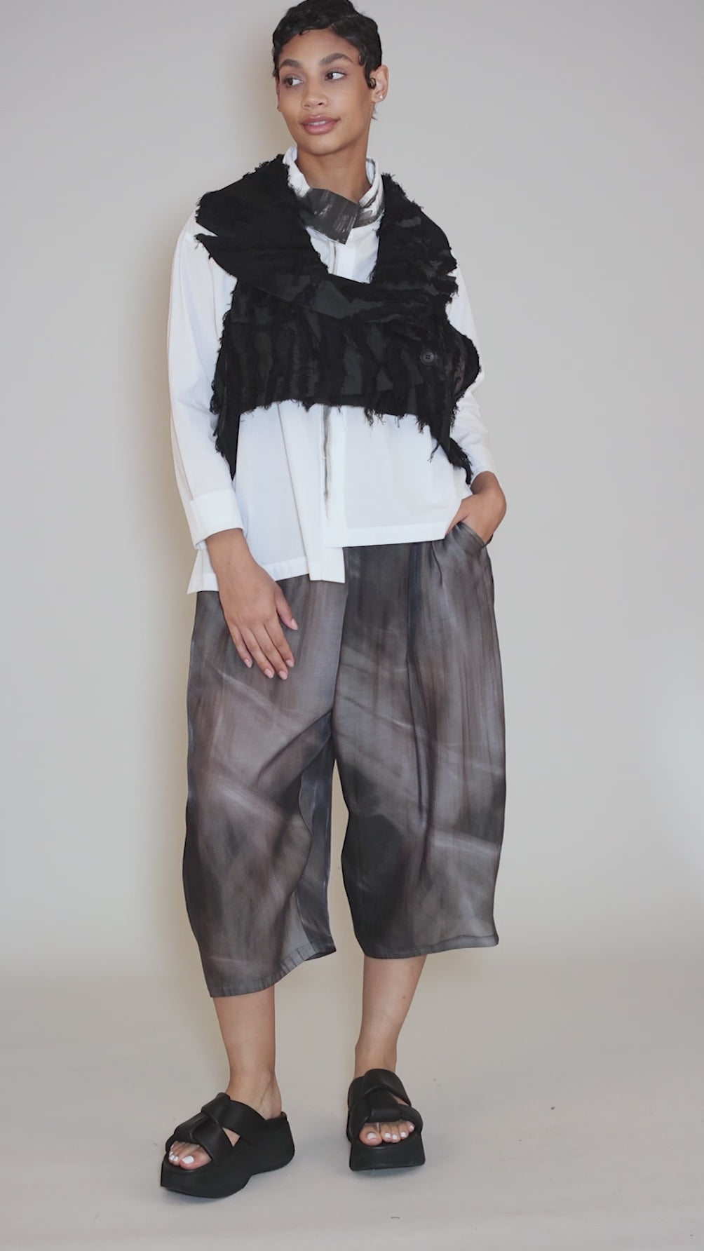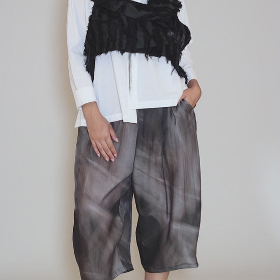 The fabric here is so lovely, a refined woven with an airy vibe and subtle sheen. The pants have a flat-front waistband that's elastic in back, and belt loops that add a layer of functionality and fun. They feature a deeply extended rise; wide, full legs; and slit pockets on the hips. With their relaxed fit and full, draped legs, these pants look like a skirt at first glance.
