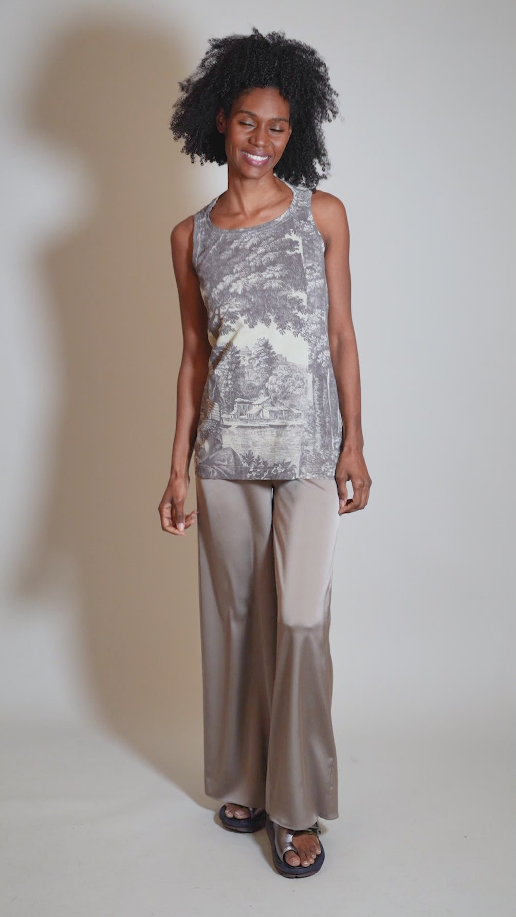 So soft and pretty! Albrecht has a wide, shallow neckline and a gentle, A-line silhouette. The length hits a the low hip on most, making it ideal for layering. The print here is a Renaissance-style illustration of a pastoral scene.