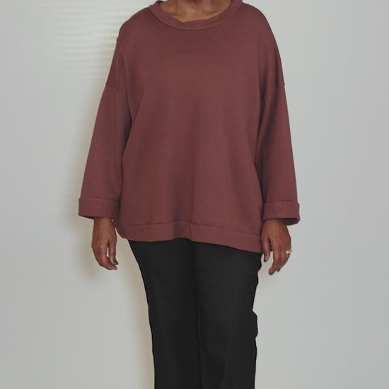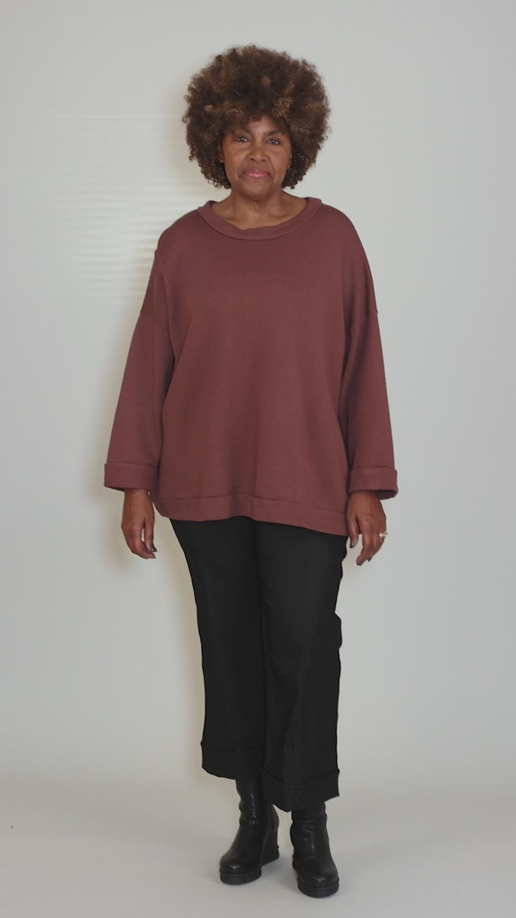 Stay cozy all winter long in Bryn Walker's beloved Alden Shirt. It's made in a very soft cotton-bamboo fleece, with long, full sleeves and a short funnel neckline. The fit is quite oversized and roomy throughout.