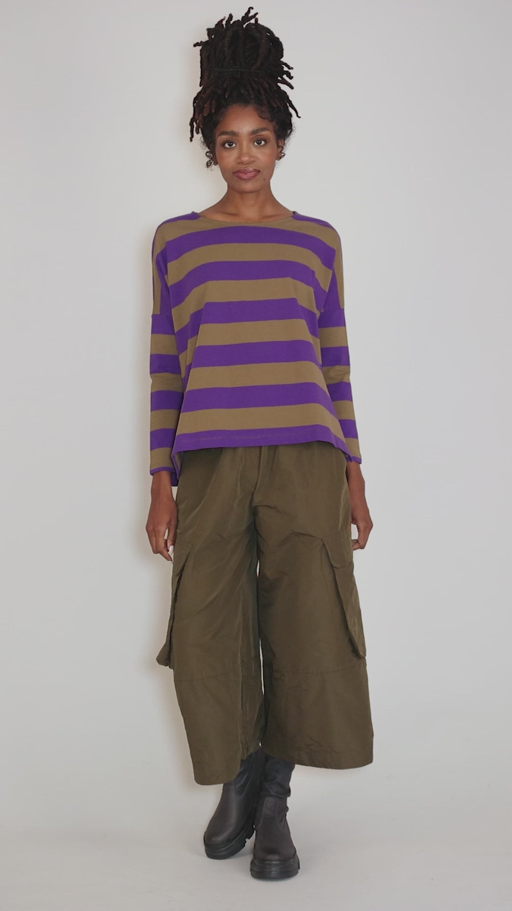 Made in a woven poly with an innate sheen, Miss Hall has an elastic waistband, with very full, legs that stop just above the ankle on most. Slit pockets sit on the hips, and patch pockets sit on the thighs. Think of them as a refined cargo pant. Running a bit on the large side.