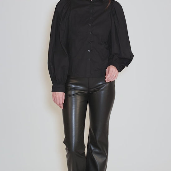 A modern bootcut with vintage inspiration, Ally offers a high rise and a slightly wider leg for a relaxed fit. Ally is made in Pistola's signature alternative leather in Onyx, a rich black coated finish that elevates the classic silhouette with sleek sophistication. We especially love Ally back to chunky knits, but she also works beautifully with the silks and velvets of the holiday season. Running true to size.