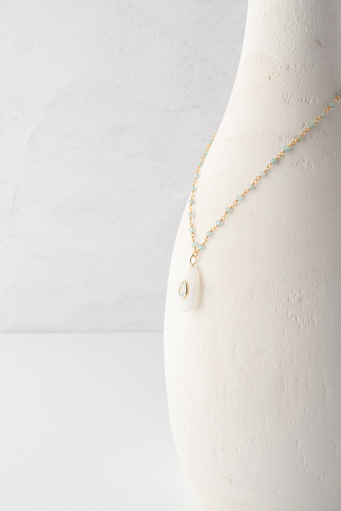 Ethereal and eye-catching, this necklace features a luminous rainbow moonstone paired with a tiny faceted aqua cubic zirconia bezel for a subtle pop of shimmer. Strung on a delicate 14K gold filled chain and accented with vibrant apatite beads, it carries a dreamy, oceanic elegance—perfect for layering or wearing as a standout piece.