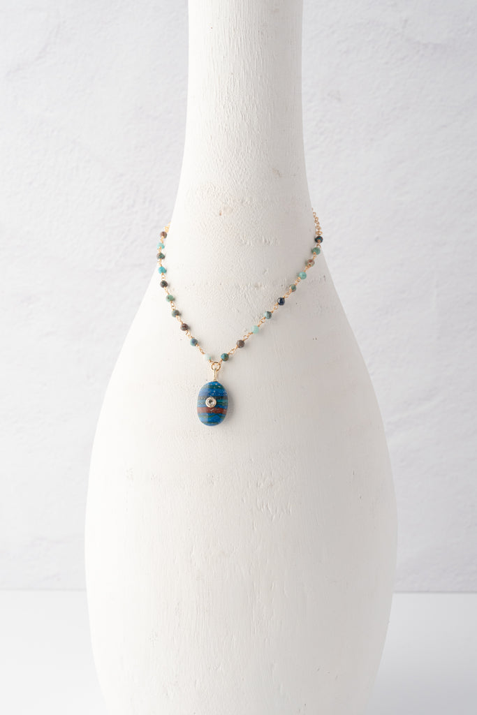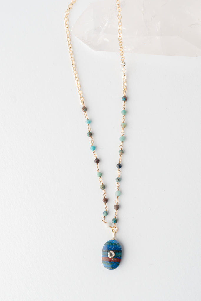 Vibrant and full of character, this necklace features a striking rainbow calsilica pendant, naturally banded with rich swirls of blue, green, and earthy tones. A tiny faceted cubic zirconia bezel adds a touch of shimmer, perfectly complementing the stone’s colorful depth. Finished on a fourteen karat gold-fill chain adorned with deep blue-green chrysocolla beads, this amulet necklace captures the grounding beauty of earth and sky in one artful piece.