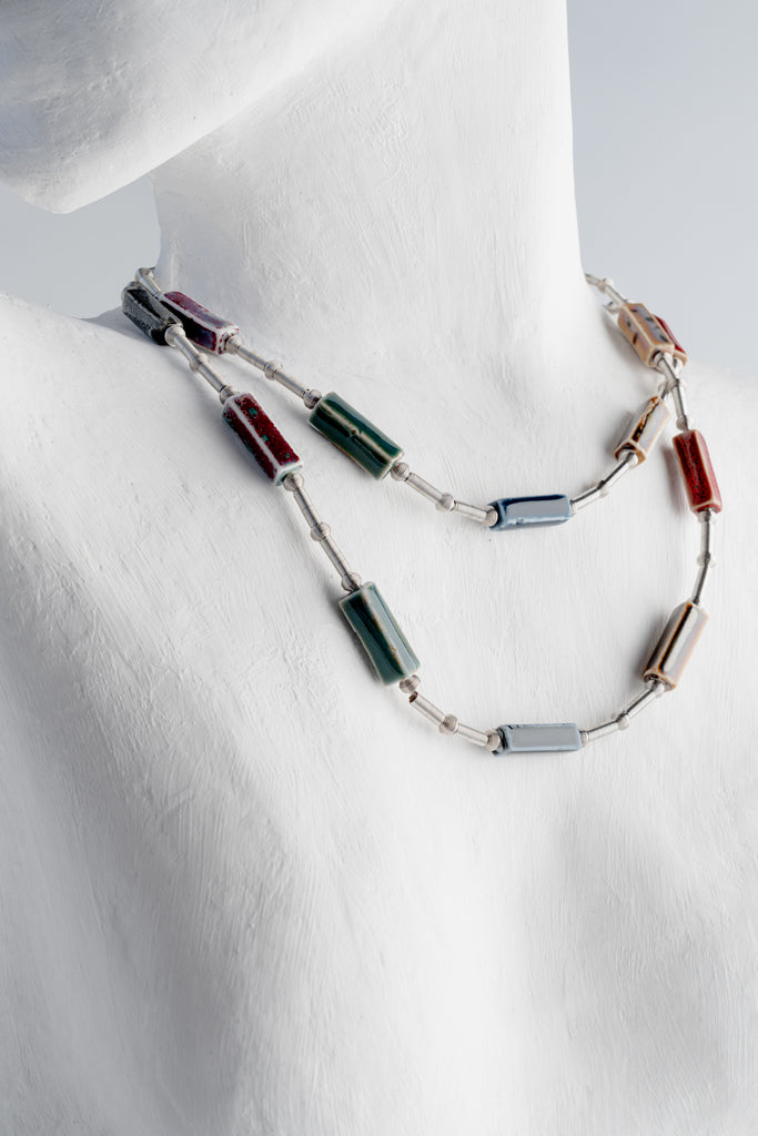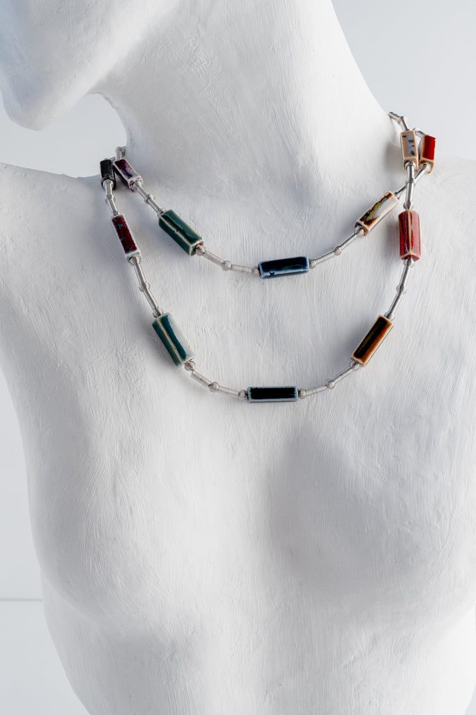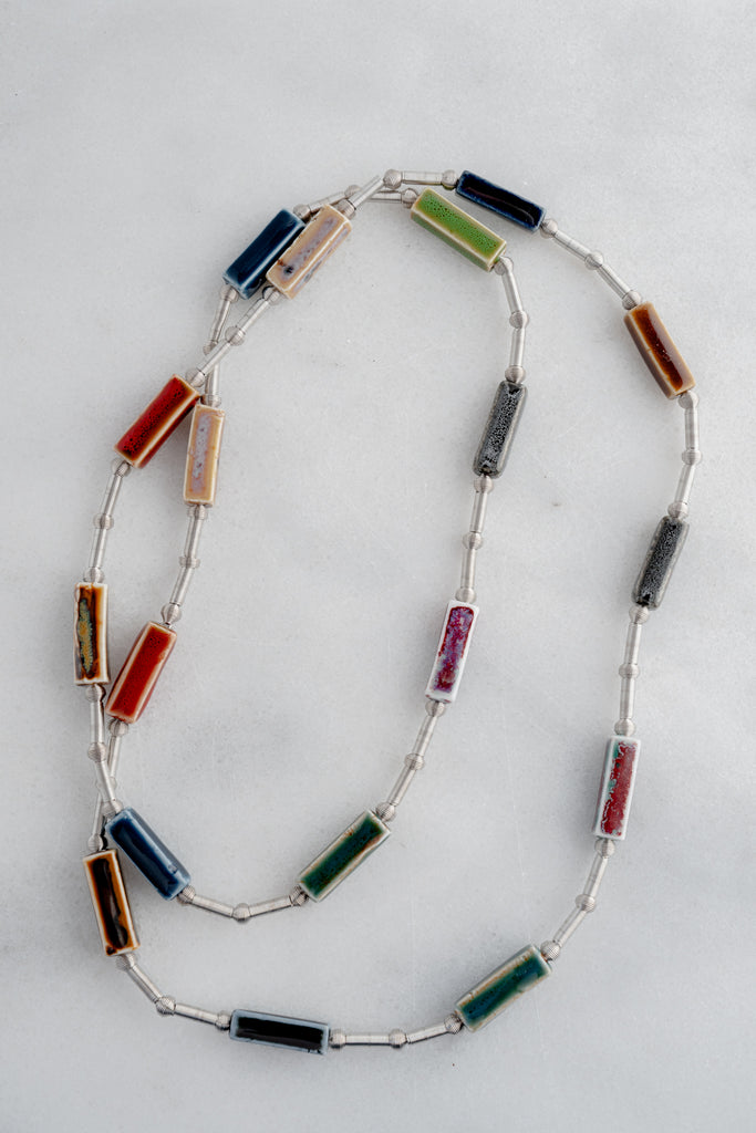 The Amy Necklace is a long, lightweight piece with a gallery feel: slim silver-toned wire links are dotted with glossy rectangular beads in deep blues, greens, rust, cream, and charcoal. Each bead looks like a tiny brushstroke, the whole strand feels like a wearable composition.