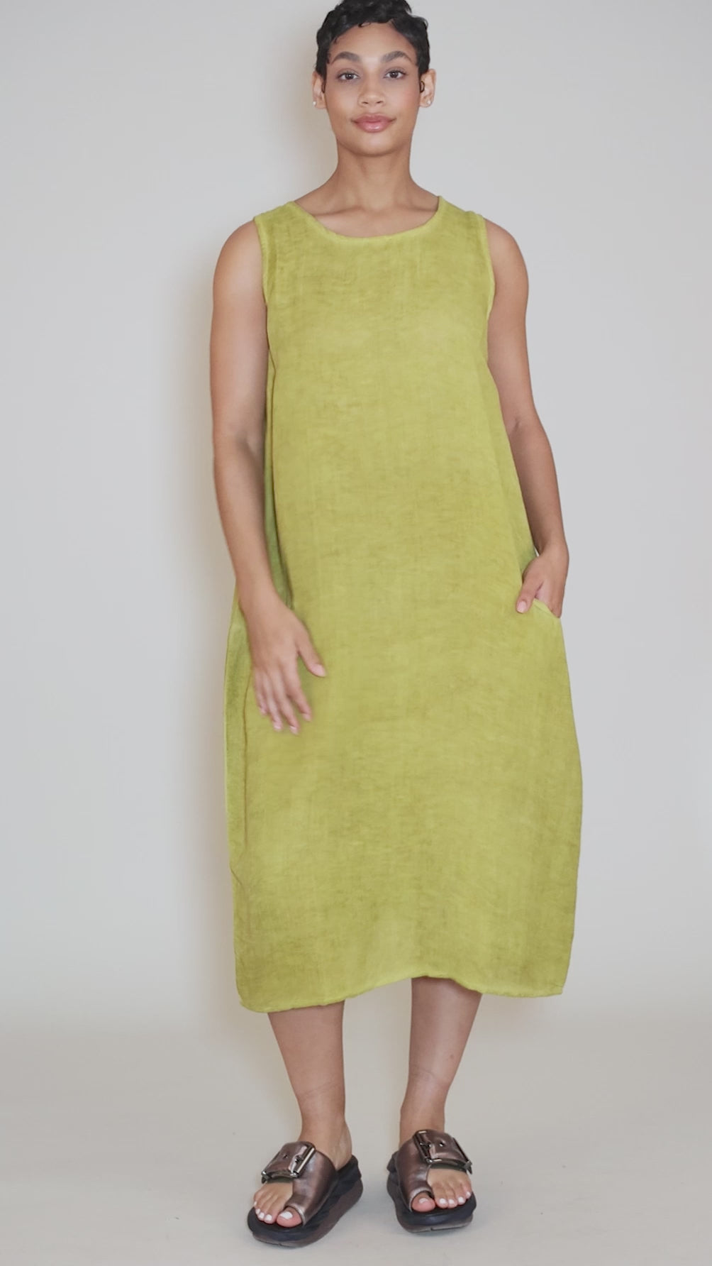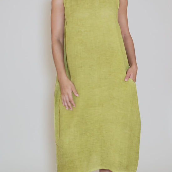Made in a garment-dyed linen, Anita is all about the simple lines, from its bra-friendly straps to its full, A-line silhouette. Running on the large side.
