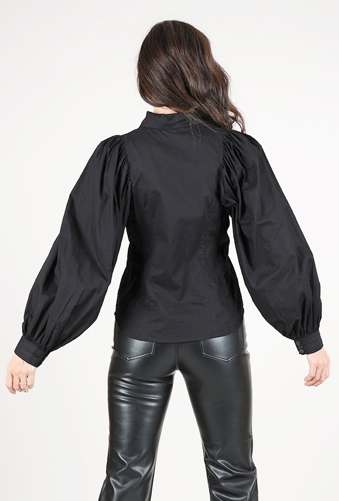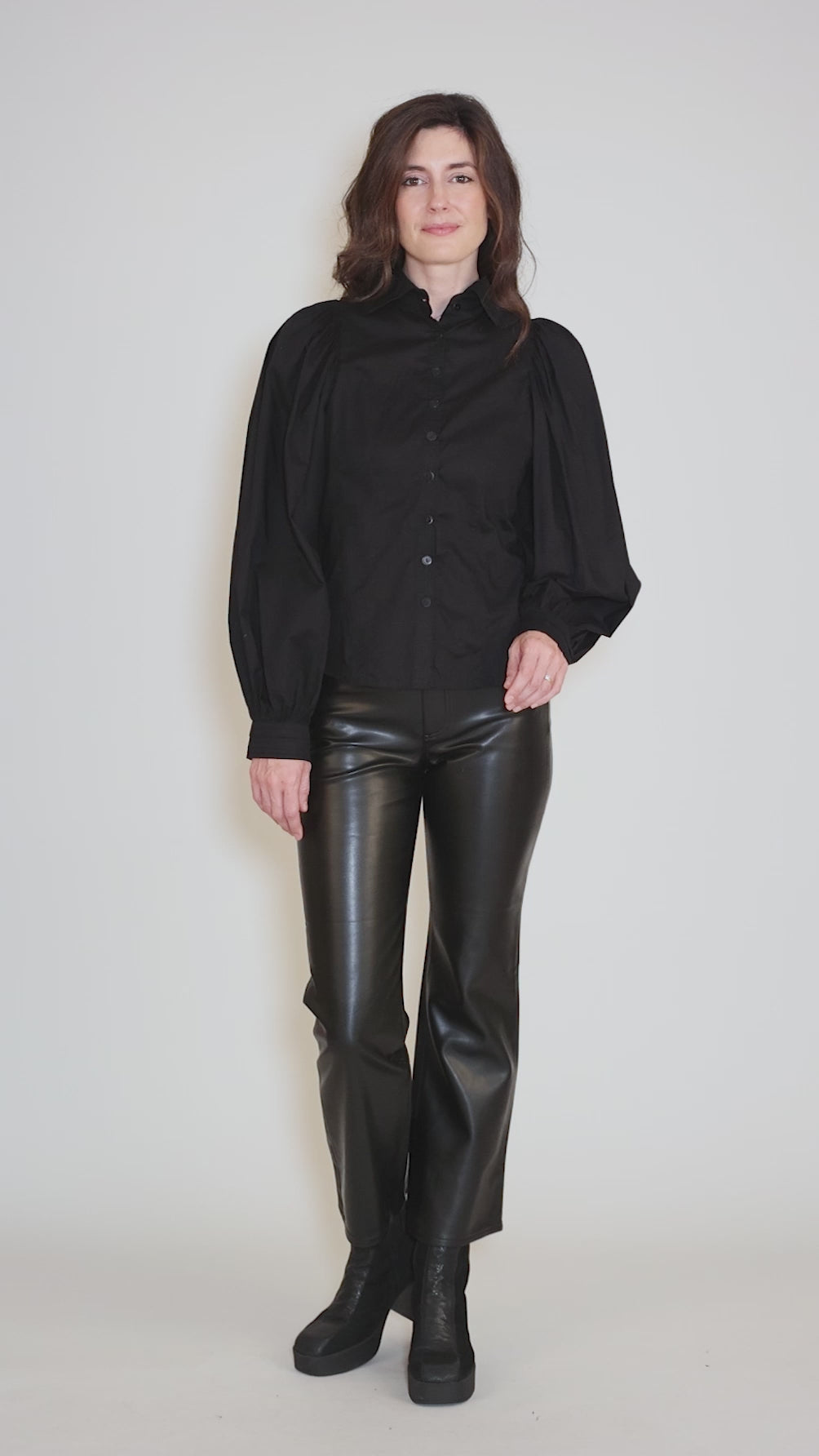 Made in a very crisp woven cotton poplin with an innate sheen, Ansley has a small shirt collar, a button front placket and princess seaming that creates a body-conscious fit through the mid-section. But the headline here are the extravagantly full sleeves, which stem from shoulder pleats and end in button cuffs at the wrists. Running a bit on the large side.