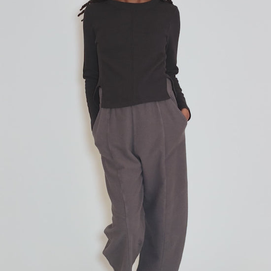 The fabric here is SO soft, a brushed cotton fleece that's fuzzy on the surface and smooth on the backside. It's used beautifully in these cool pants, which offer all the comfort of a sweatpant with the style of a barrel-legged trouser. They have a drawstring at the waistband and a relaxed fit. We find these are running on the large side for the brand.