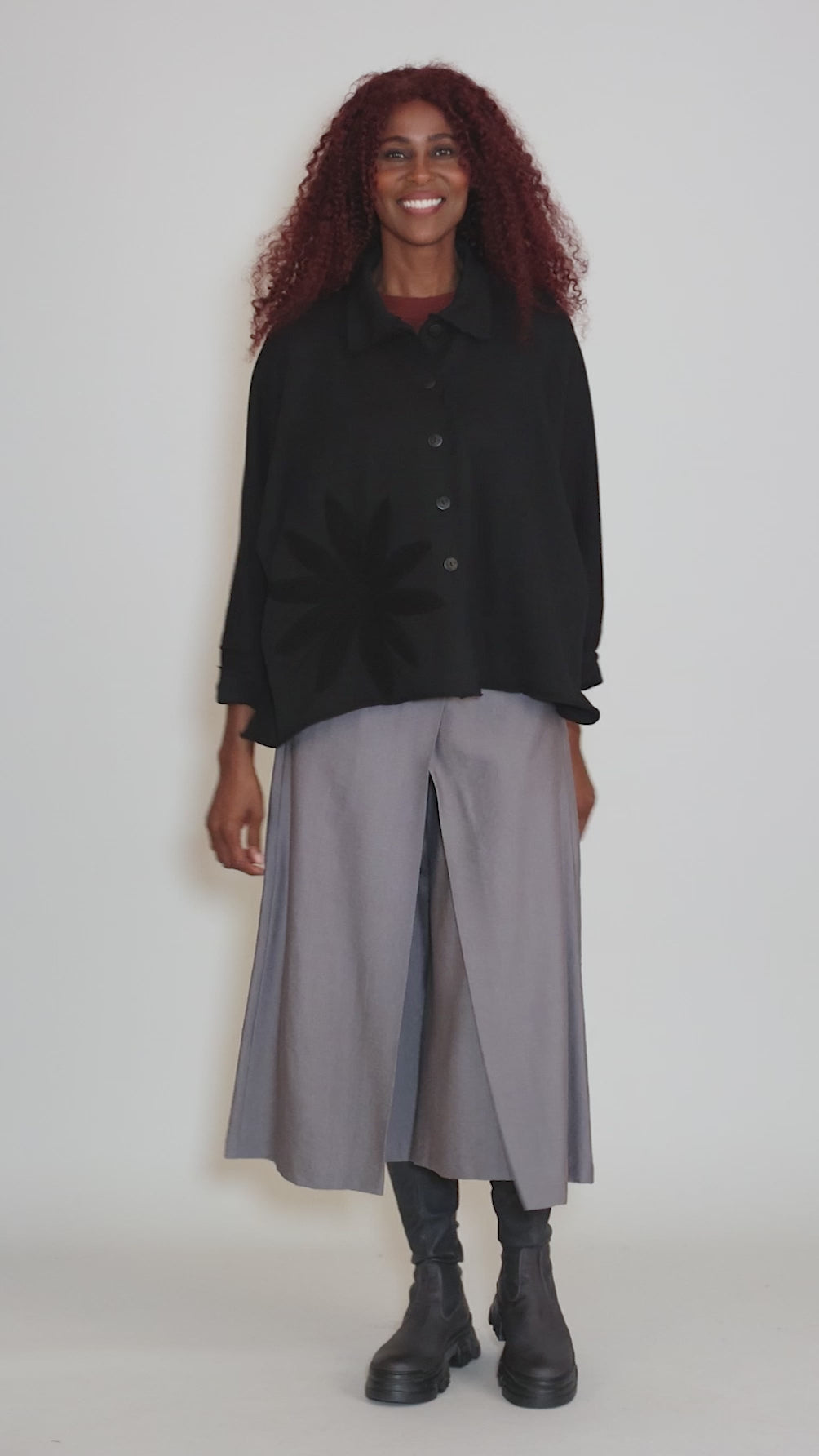 How cute is this little sweatshirt jacket? It has a button-front placket, with a deliberately boxy body and a drop-shoulder construction. The dolman sleeves are long, tapering to the wrist, and a tonal flower applique sits on the sides. Running on the large side.