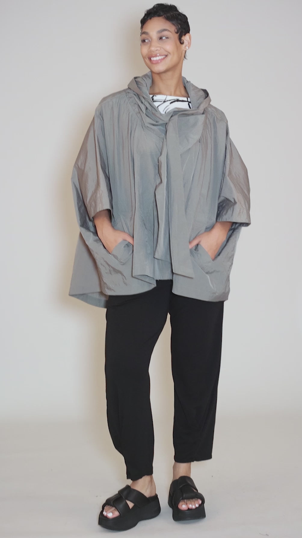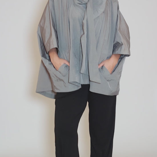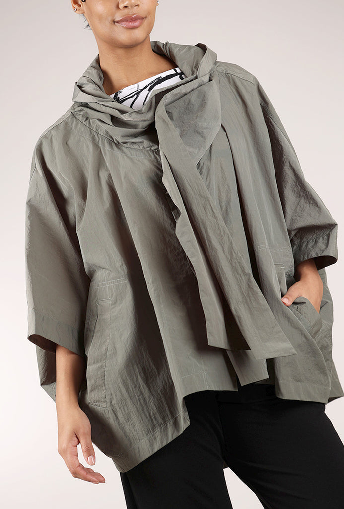 Made in a weather-resistant poly blend with a terrific sheen and texture, this oversized jacket has an asymmetric button placket, with deep dolman sleeves and an oversized hood. Patch pockets and an oversized hood add to the fun.