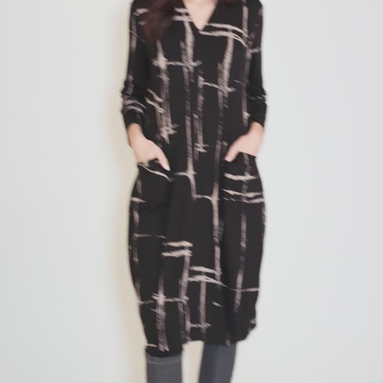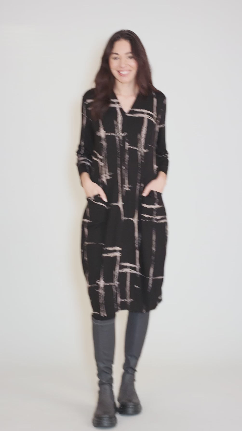 A go-to basic dress for everything from fetes to funerals, Arthouse Grid is crafted in Olivia's signature rayon jersey knit, which has a smooth hand and excellent drape. The dress has a V neckline, bracelet-length sleeves and a subtle lantern shape -- easy through the thighs and hips, before tapering gently to below the knee. Pockets sit on the hip.