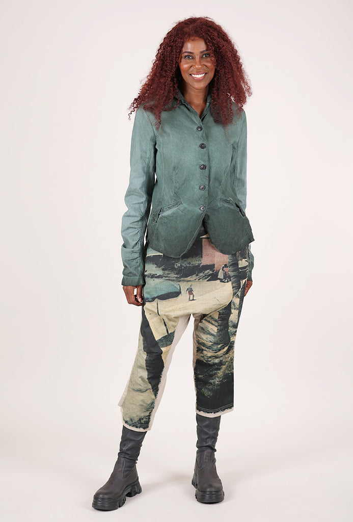 We love the fabric here, a midweight woven cotton blend with innate stretch and structure. The pants have a self waistband, with a slouchy rise and a slightly cropped inseam. The print here is delightful, a vacation postcard in front, complete with a message and address on the back.