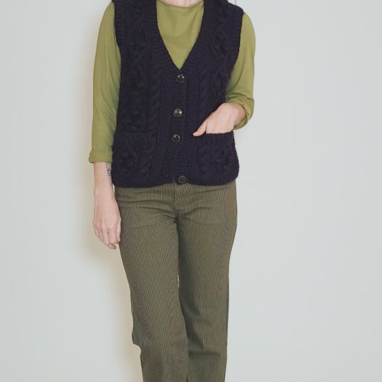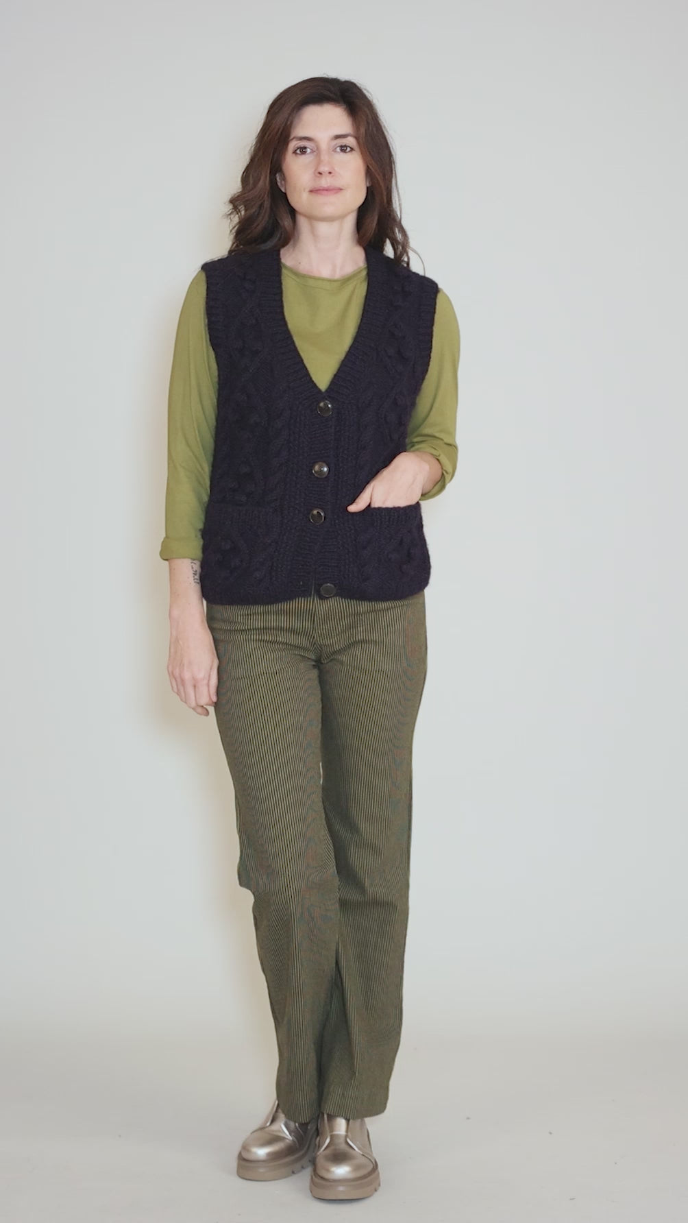 Hand-knit in a substantial wool blend, Bertie has a deep V neckline, with a button-front placket and a deliberately boxy silhouette. The armholes are a bit deep, all the better for layering, and patch pockets sit on the hips.
