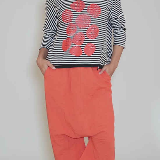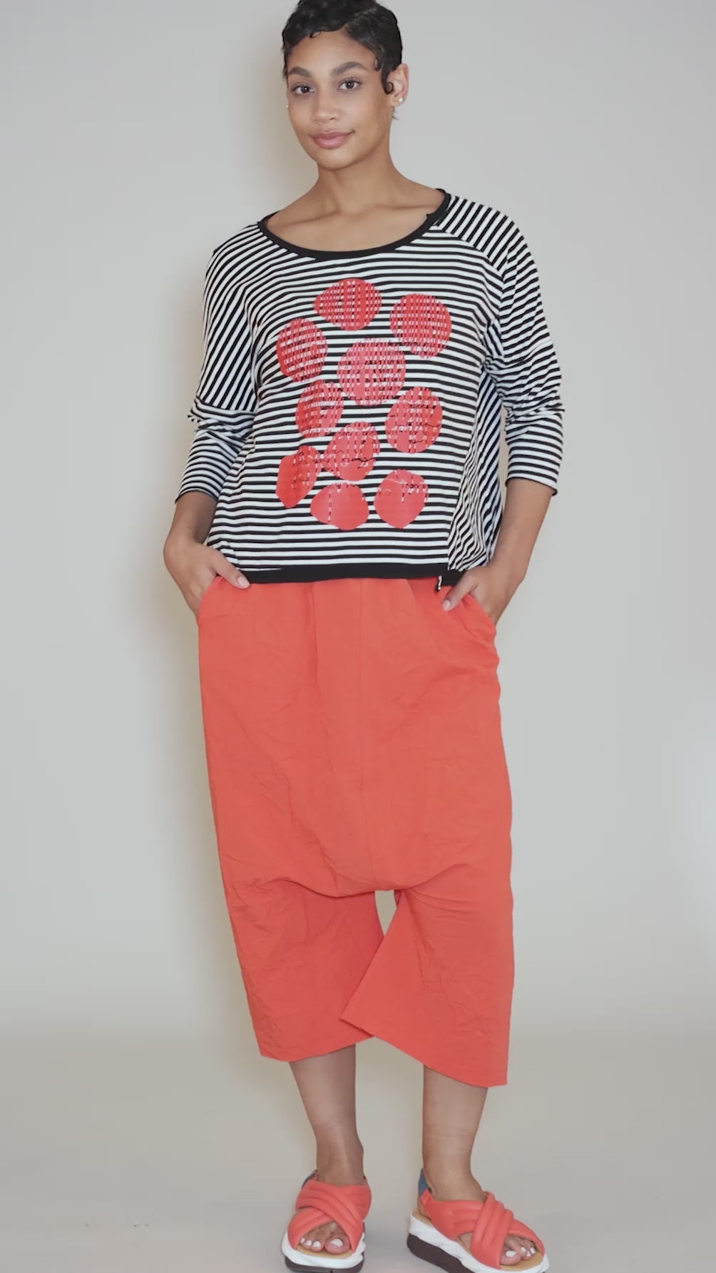 Love this top! It's made in Luukaa's signature jersey knit blend, both smooth and soft, with a rounded neckline, a drop-shoulder construction and a generously full shape. It hits at mid-hip on most wearers, with contrast trim at the hemline and neckline. The graphic represents sliced mandarin oranges, a motif of the season for the brand. Running a bit on the large side.