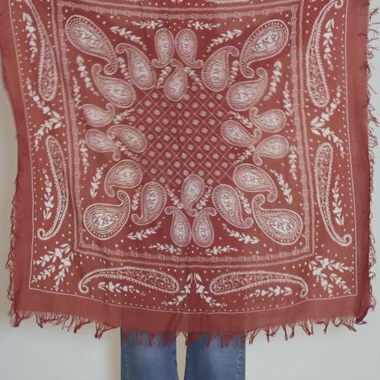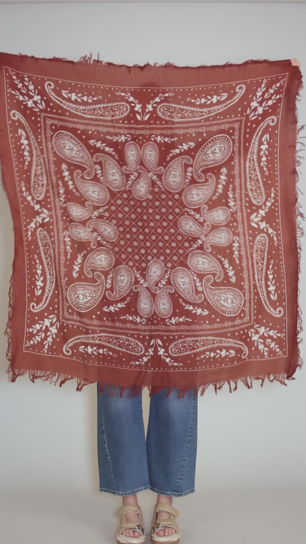 A beautifully soft scarf, printed to look like a VERY oversized banadana! It's made in a luxe cashmere-wool blend in shades of rusty henna and ecru.