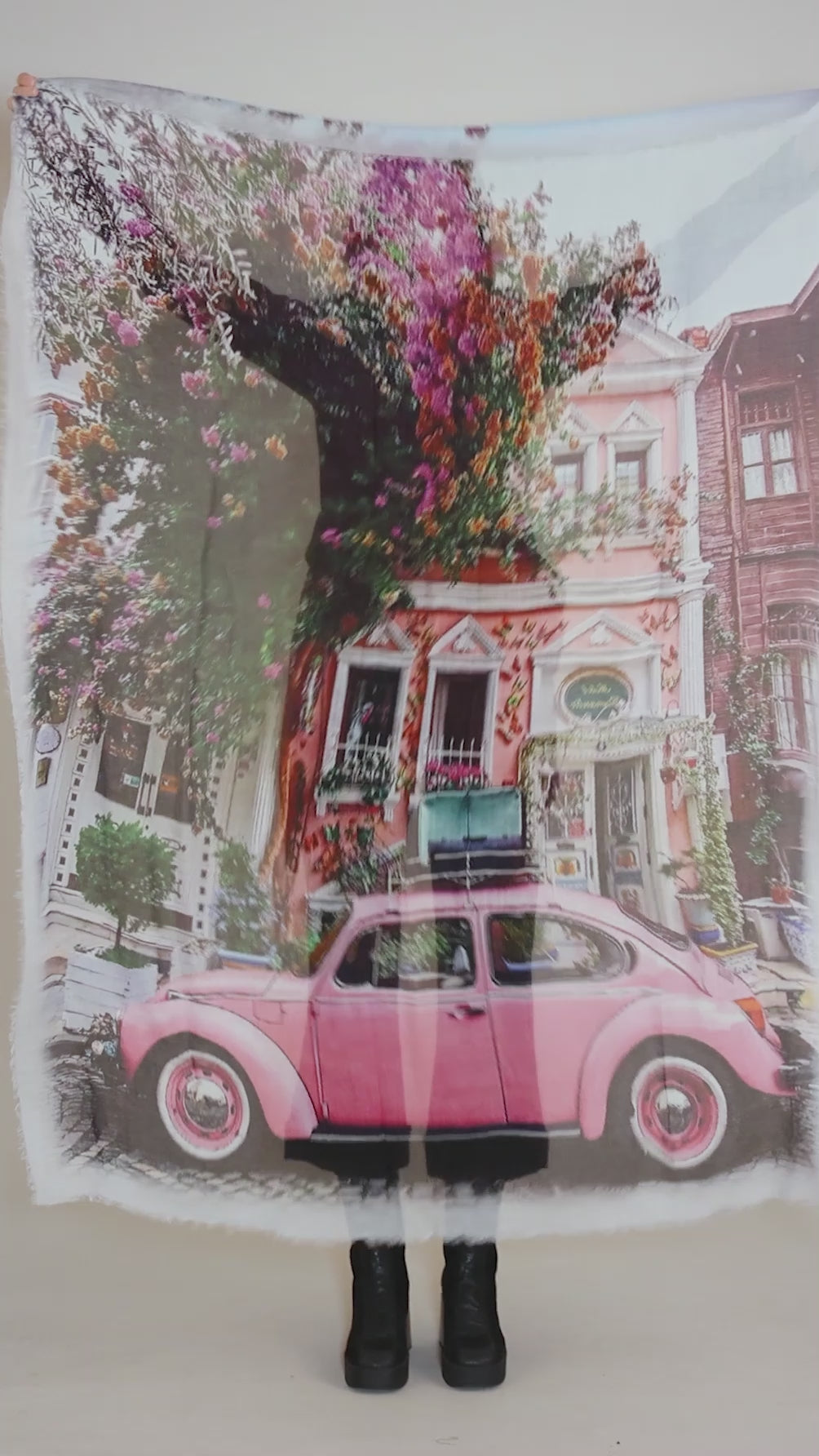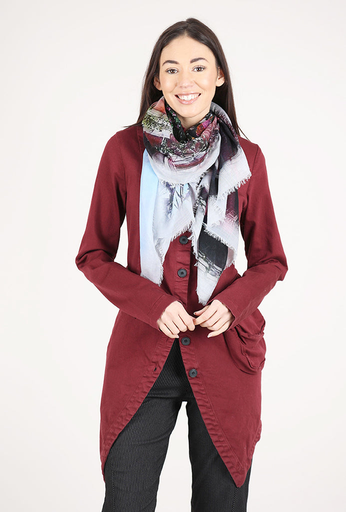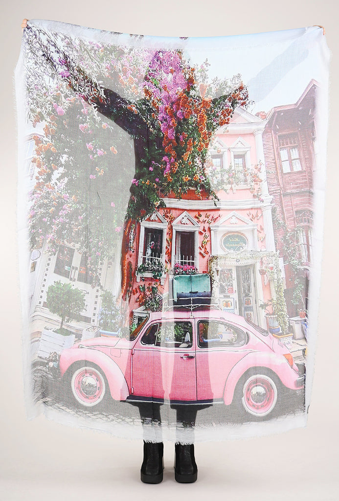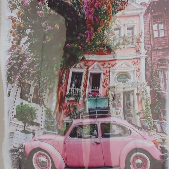 This lightweight scarf is done in a very fine blend of Modal in shades of ecru, green and pink. It unfolds to reveal an vintage street scene.