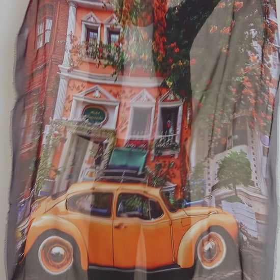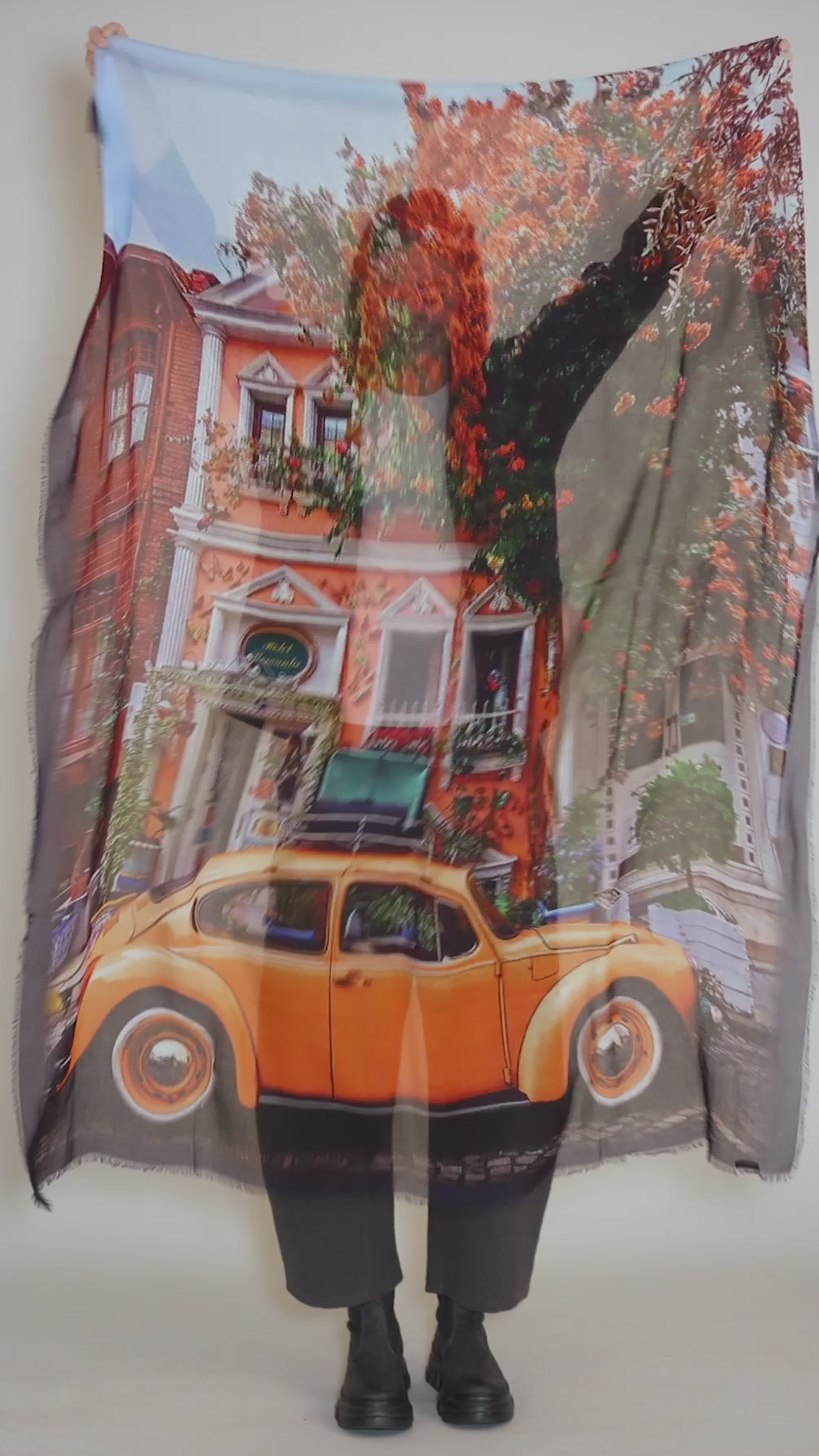 This lightweight scarf is done in a very fine blend of Modal in shades of blue, green and orange. It unfolds to reveal an vintage street scene.