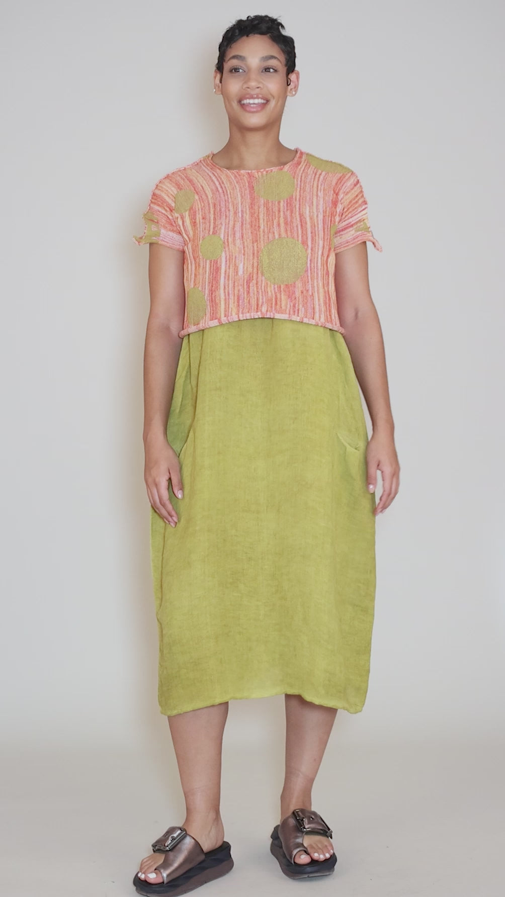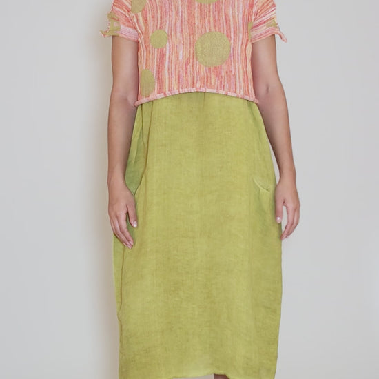 How fun is Boba? Knit in a soft cotton blend, she has a rounded neckline, short sleeves and a cropped length that makes her perfect for layering. The colors here are summertime delightful -- shades of ecru and orange, with hand-screened dots in mustard.