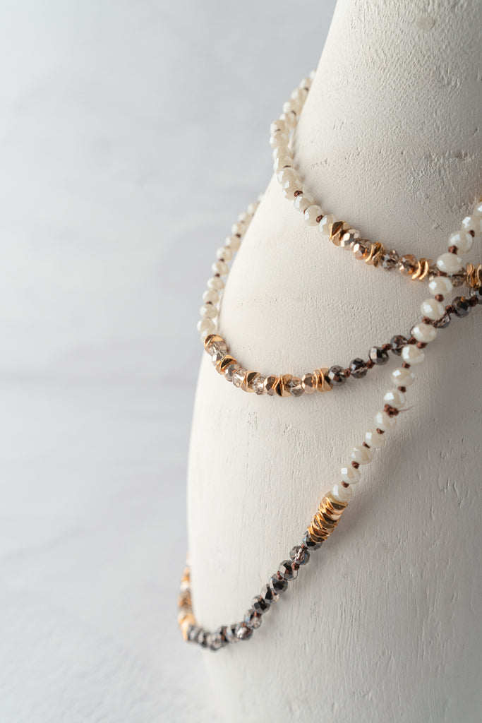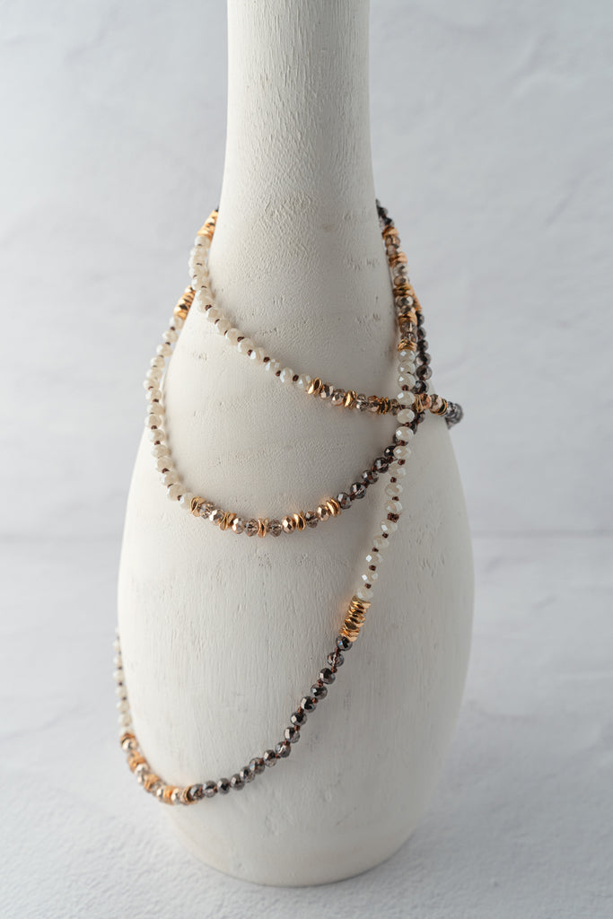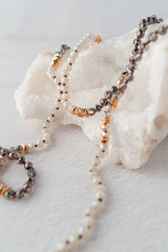 A versatile strand that balances shimmer and warmth, the Bobby Necklace features a mix of faceted beads in ivory, smoke, and gold tones. Each bead catches the light with subtle sparkle, while golden accents add a refined touch. Long enough to wear doubled or as a single strand, it’s a beautiful layering piece for any season.