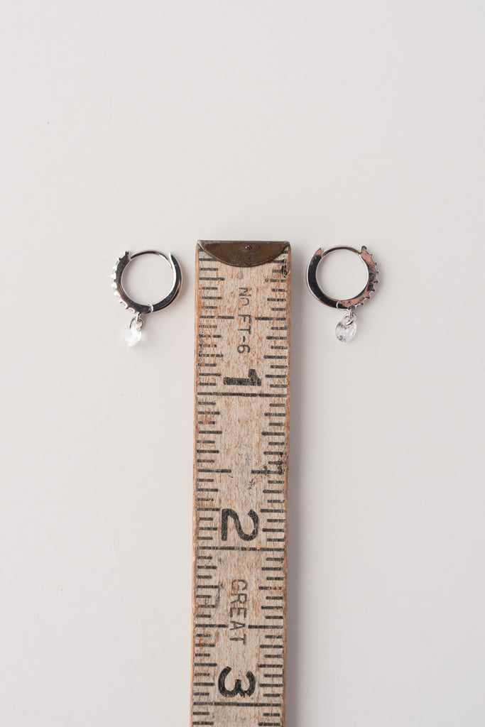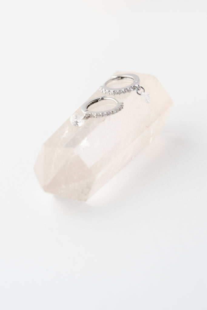 Crafted from sterling silver, these petite huggies deliver effortless sparkle with a row of shimmering cubic zirconia stones along the front. A single dangling cubic zirconia charm adds just the right touch of movement and shine. Lightweight, refined, and endlessly wearable, they’re the perfect pair for everyday style or for layering with your ear stack.