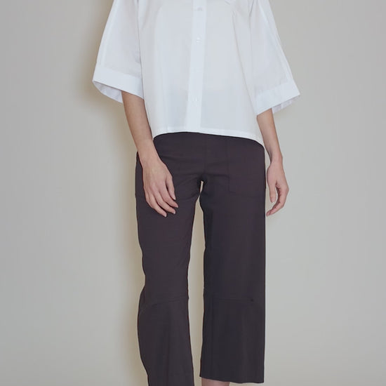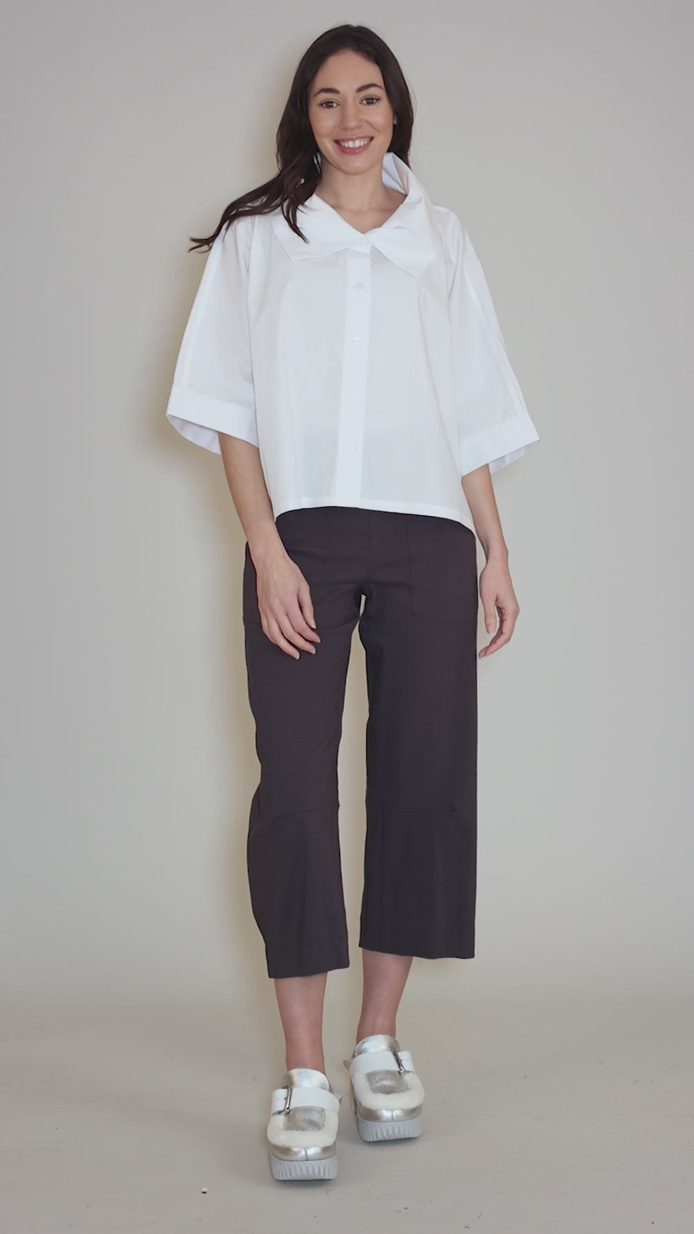 Bonita has a very generous fit, with short dolman sleeves and a button-front placket; the length is slightly cropped to wear back to fuller-legged bottoms, and the hemline is subtly high-low.