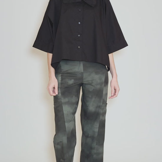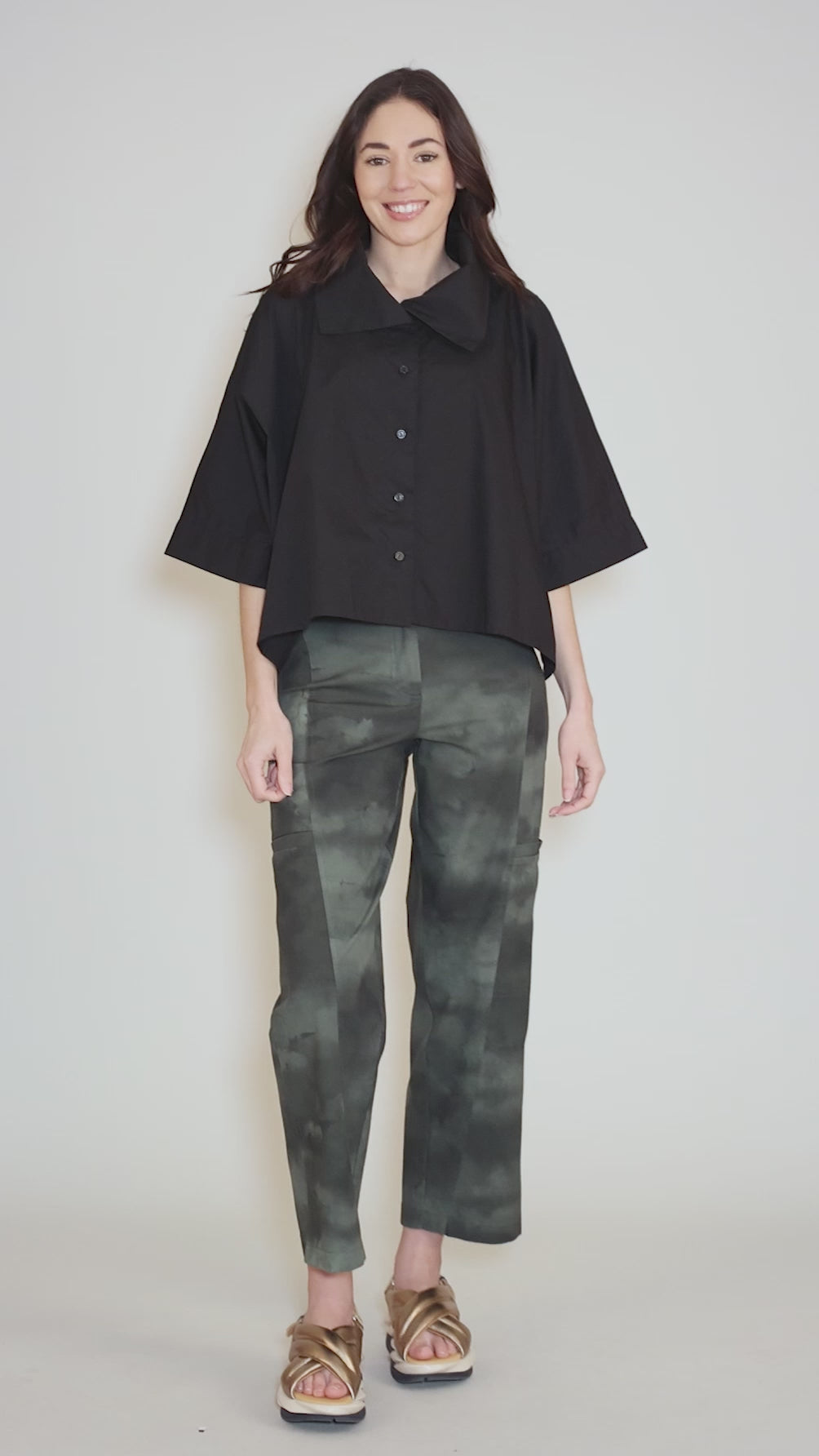 Bonita has a very generous fit, with short dolman sleeves and a button-front placket; the length is slightly cropped to wear back to fuller-legged bottoms, and the hemline is subtly high-low.