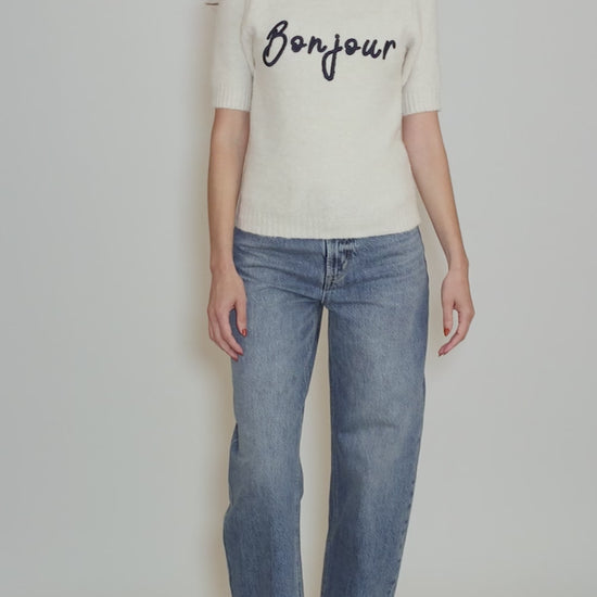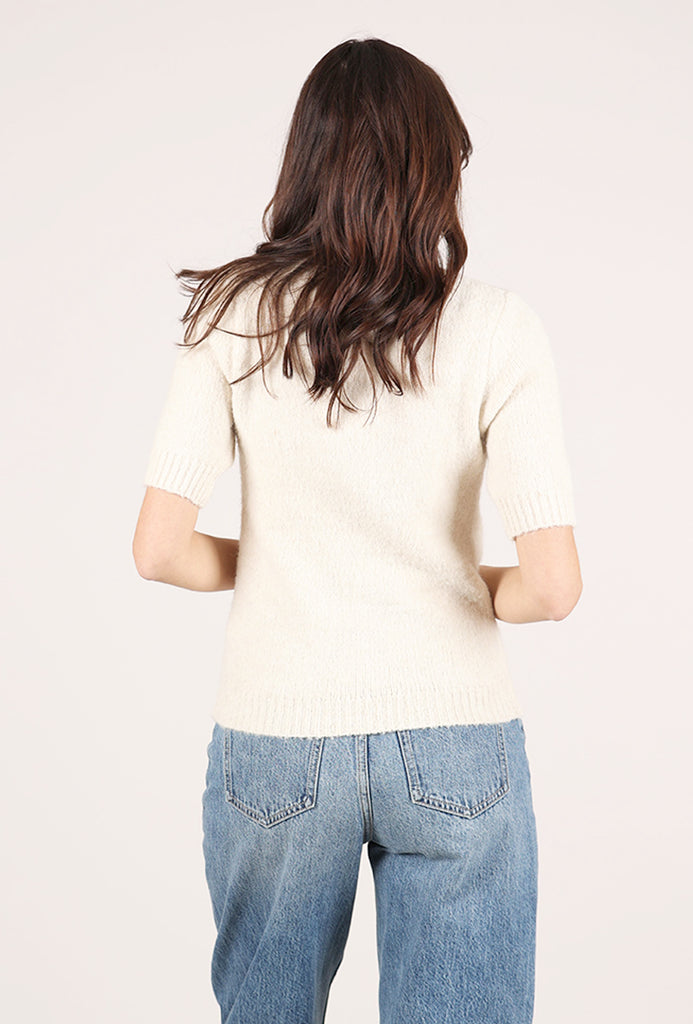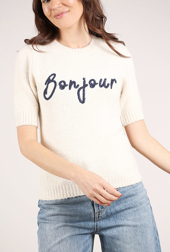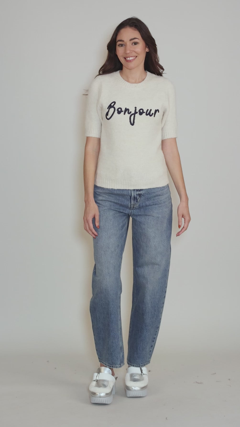 Say hello to the Bonjour sweater! Densely knit in a substantial poly blend, the sweater has a rounded neckline, a set-in shoulder and short sleeves. The body is somewhat shrunken with a lightly ribbed hemline and T-shirt-like fit. Running true to size to slightly large.