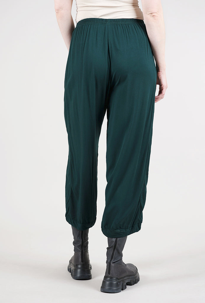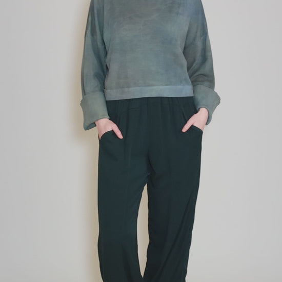 Made in a soft, drapy rayon blend with a sueded finish, the Cynthia Ashby Bristol pant has an elastic waistband, with full, lantern-shaped legs that taper a bit to the lightly banded hemline. Slit pockets sit on the hips. The fit here is relaxed and easy. Like many Cynthia styles, we find Bristol is running a bit on the large side.