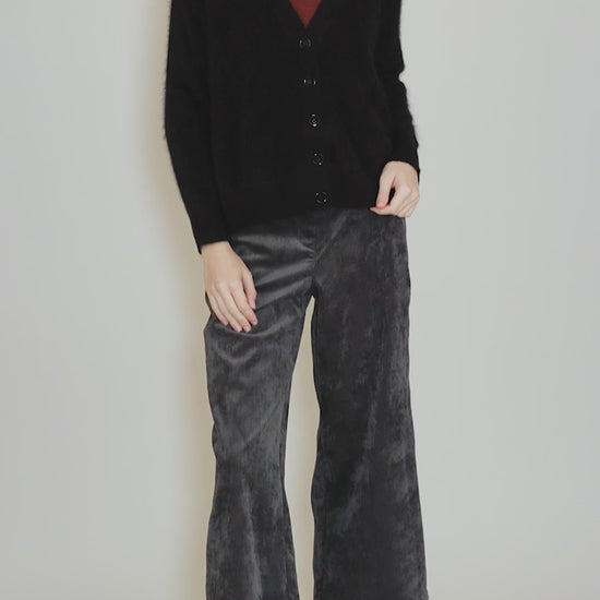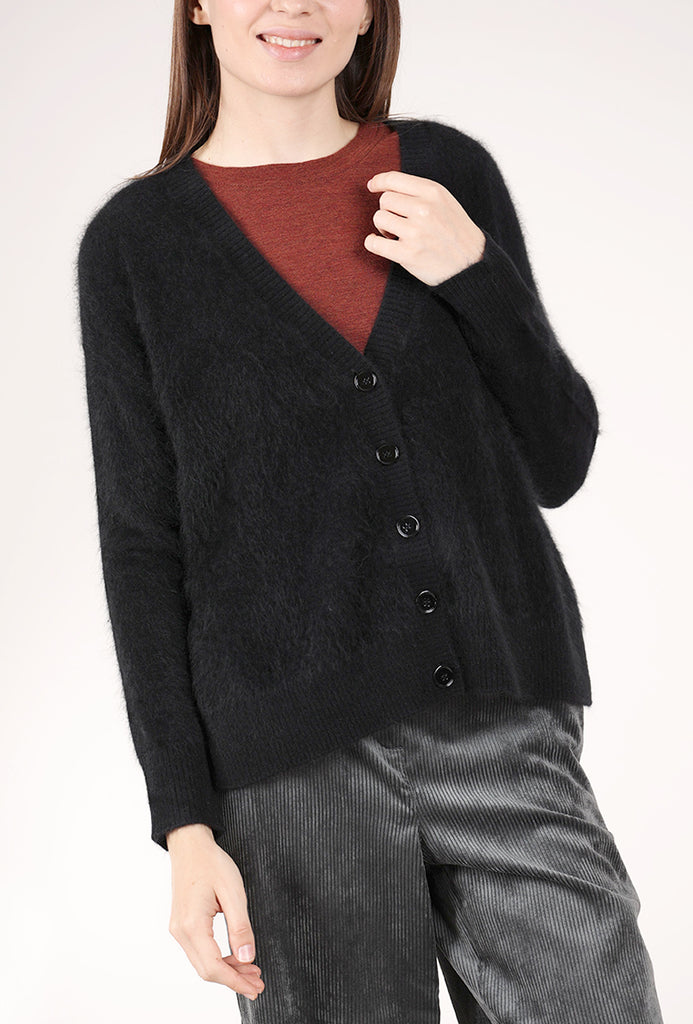 Crafted in a super-soft brushed cashmere, this sweater looks and feels like something double the price. It has extra-long sleeves, with a V neckline and button-front placket. The fit is roomy through the bust and shoulder, before tapering slightly to the lightly ribbed, high-low hemline with deep side slits. We find the sweater is running on the large side, just like we like our Grandpa cardies!