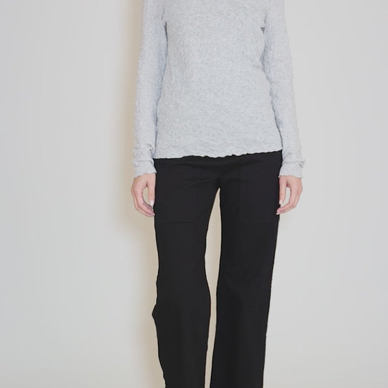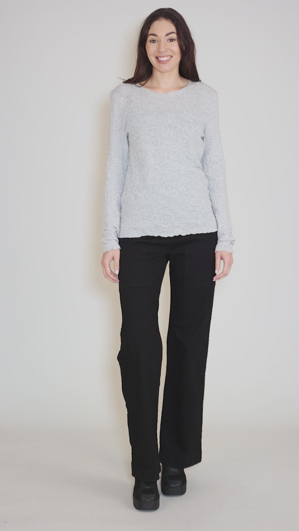 Such a good basic! Knit in a dimensional bubble weave that adds loft and a bit of airiness, the sweater has a rounded neckline, with a set-in shoulder and extra-long sleeves. The body is a trim A-line, and the lettuce-edged hemlines add a feminine touch.