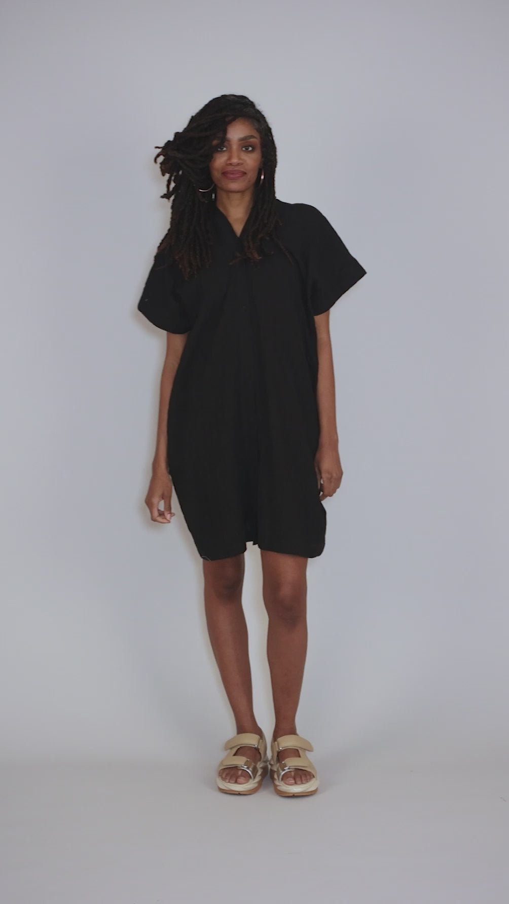 Crafted in a lightweight, woven cotton this oversized dress has a V neckline, short dolman sleeves and a cocoon-shaped silhouette. A row of buttons in front and hip pockets add to its allure. Just the thing to pack for a springtime getaway!