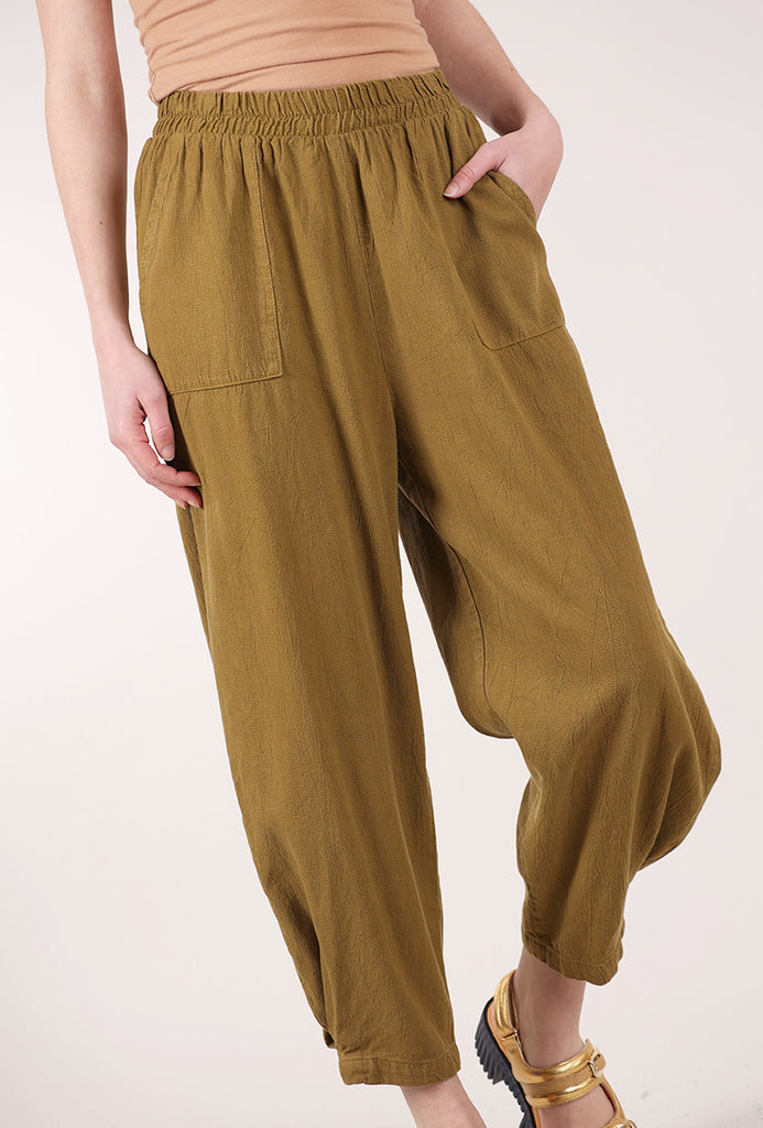Made in a nicely textured cotton gauze, Cadence has an elastic waistband and full, lantern-shaped legs that taper at the ankle. Hip pockets and a mid-rise round out its charms. Running true to size to slightly small through the tush.