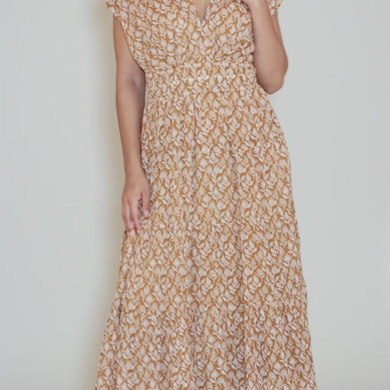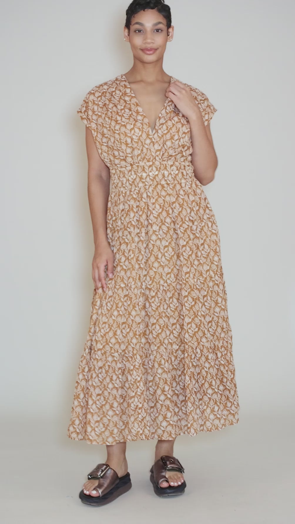 Made in a very lightweight cotton, this piece has a V neckline and short dolman sleeves; shirred details at the waist create a close (yet stretchy!) fit through the waist. The tiered skirt flares easily through the hips, ending at mid-calf on women of average height; slit pockets sit on the hips. The dress is partially lined for modesty's sake. We find this is running a bit on the small side.