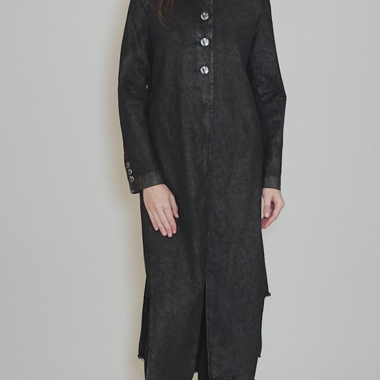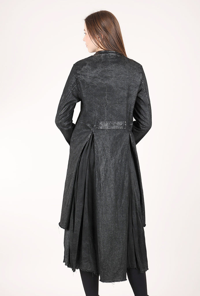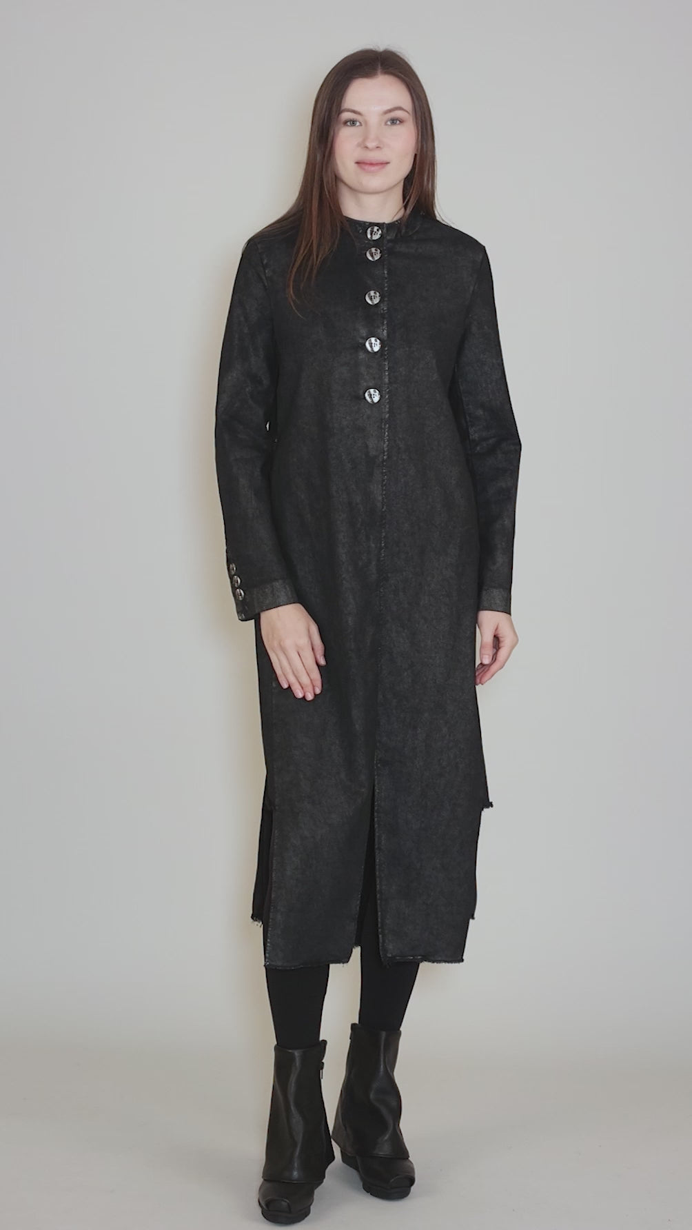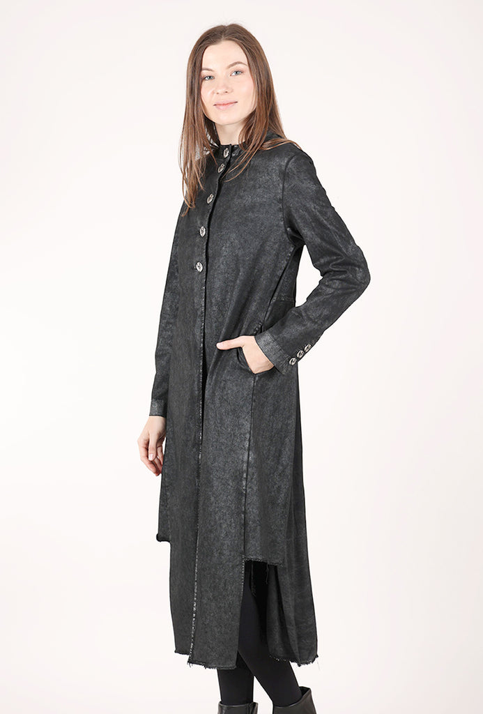 This chic piece is made in a structured cotton twill with a laminated finish that adds further crispness to the look. Cappotto has a set-in shoulder, long sleeves and a half-button placket at the bust. The hemline is uneven, with split details in back that reveal a skirt-like, woven cotton lining. Slit pockets sit on the hips. We find this is running VERY small through the bust and shoulders.
