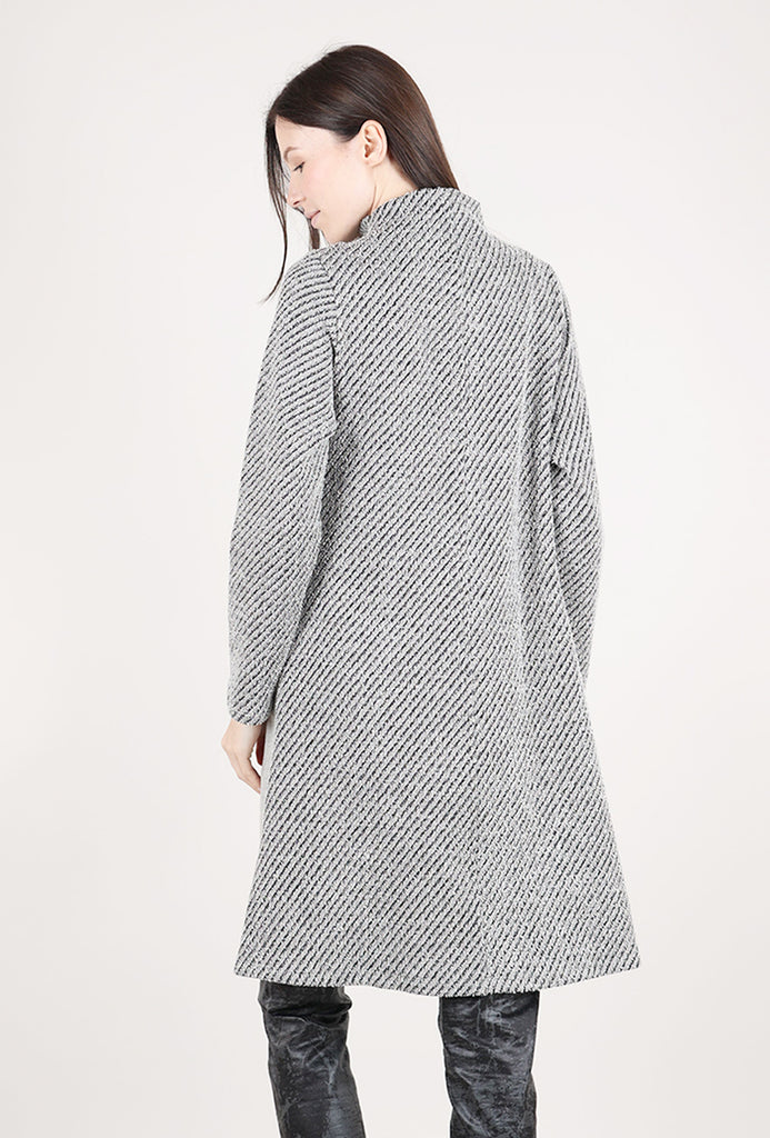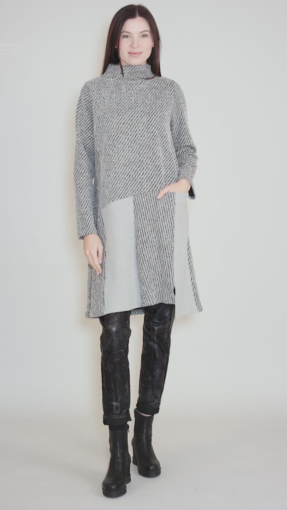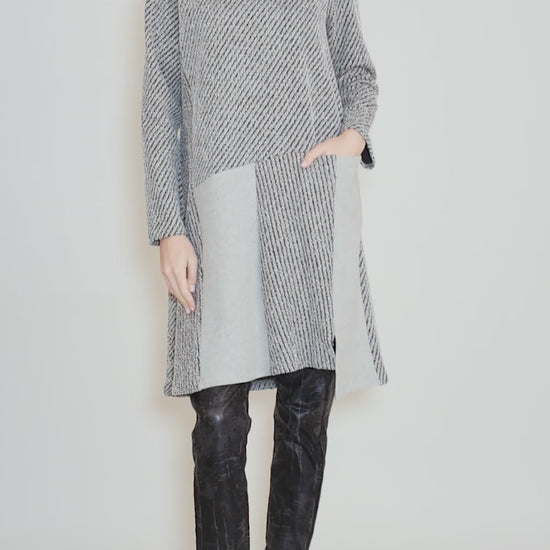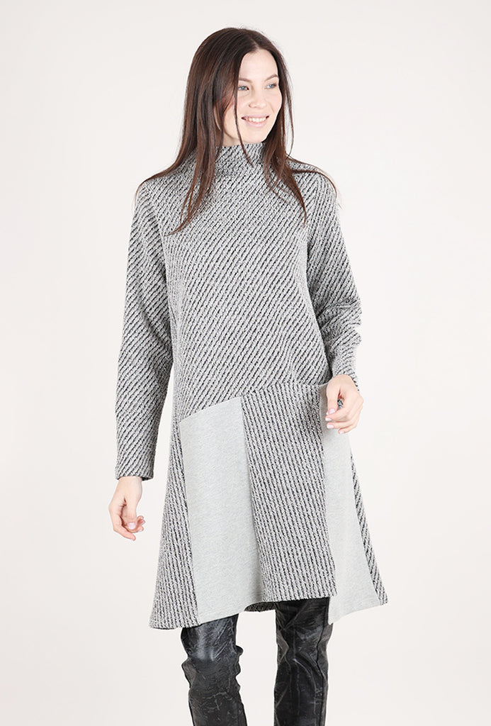 Made in a looped French terry knit with a dimensional, contrasting weave, Carina has a short funnel neckline, a set-in shoulder and long sleeves. The body is a trim A-line, with contrasting insets through the skirt. A slit pocket is hidden on one hip.