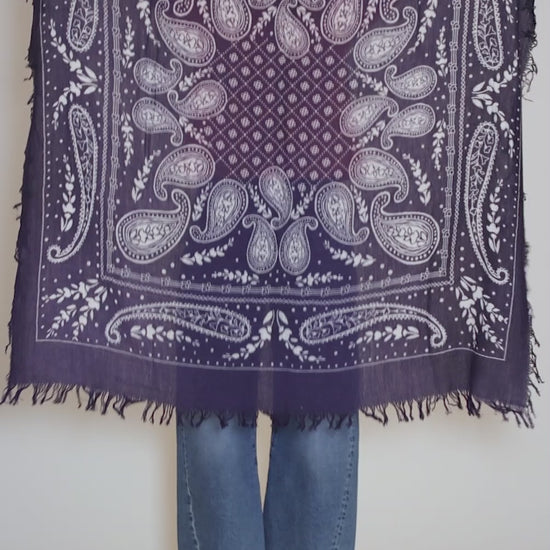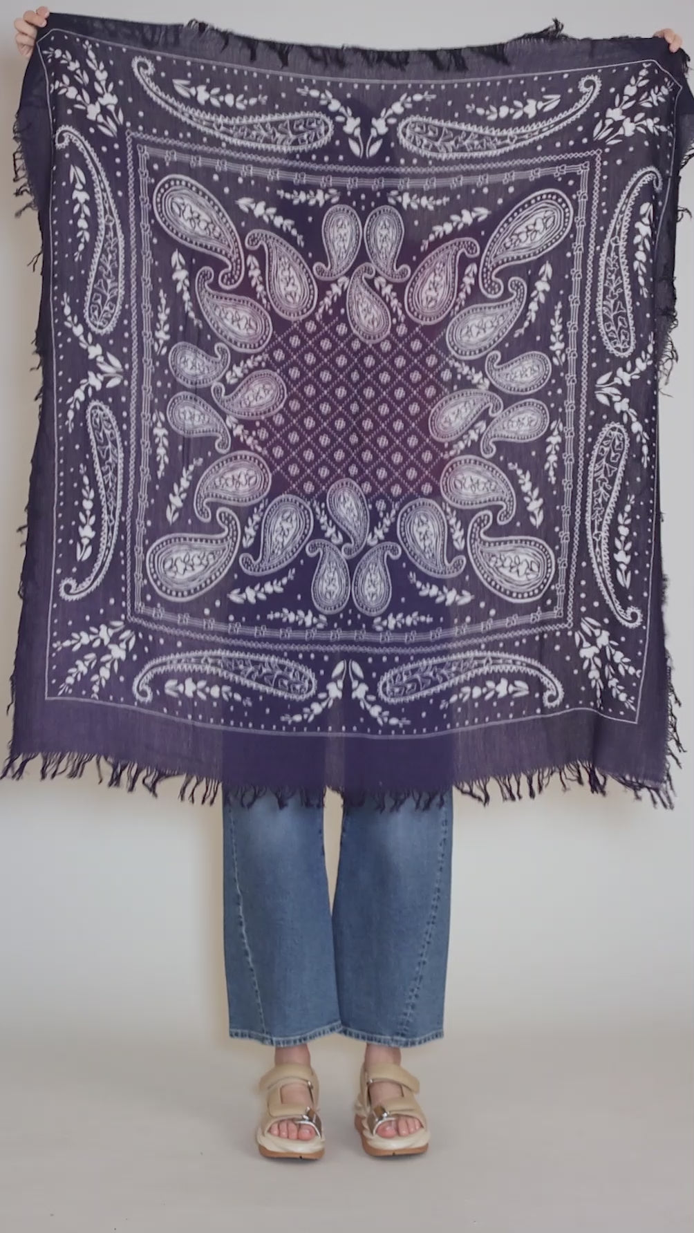 A beautifully soft scarf, printed to look like a VERY oversized banadana! It's made in a luxe cashmere-wool blend in shades of dark blue and ecru.