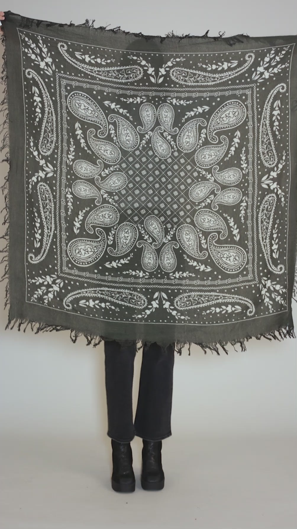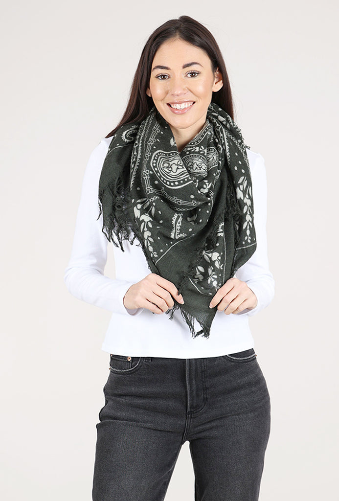 A beautifully soft scarf, printed to look like a VERY oversized banadana! It's made in a luxe cashmere-wool blend in shades of olive and ecru.