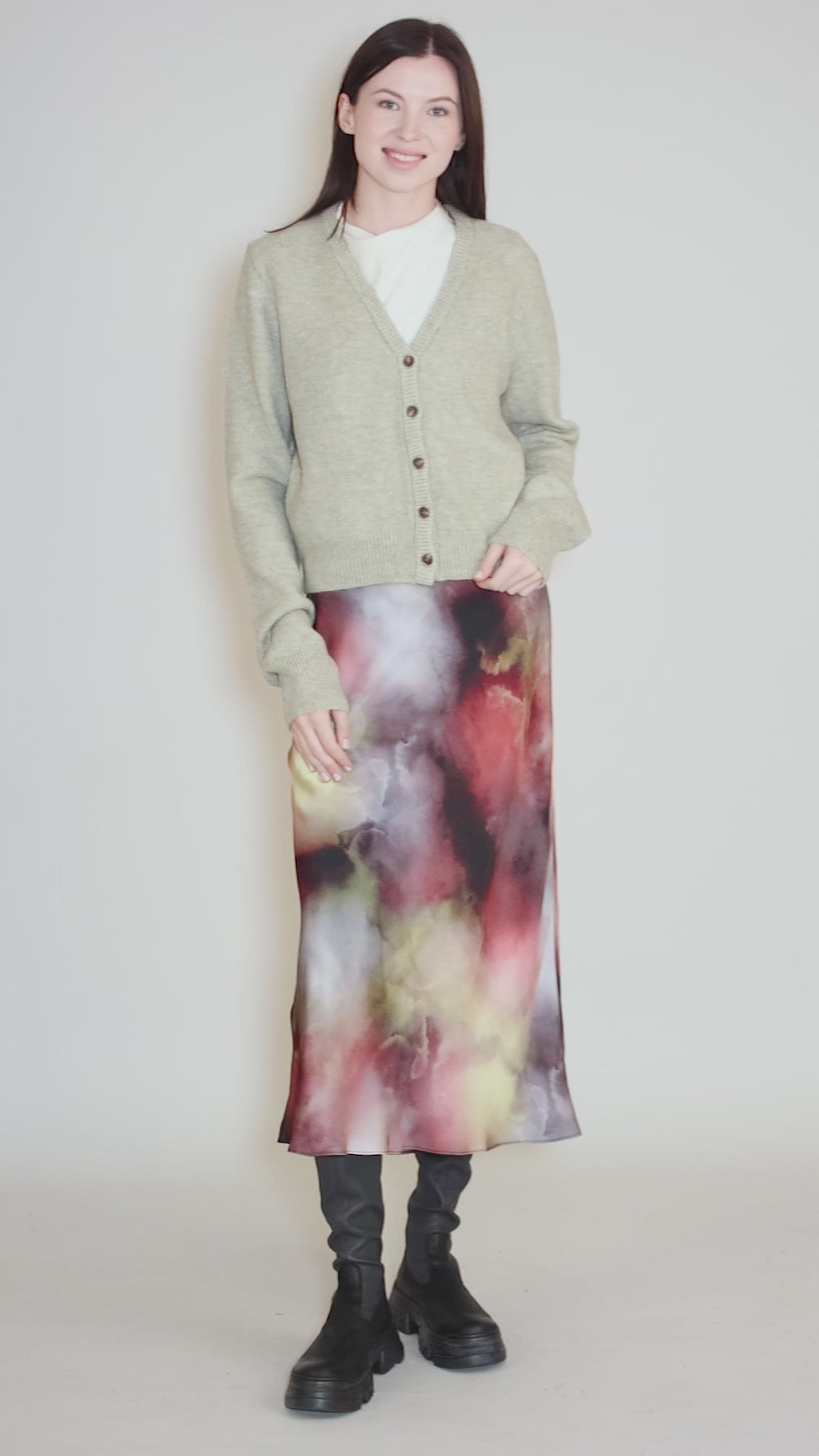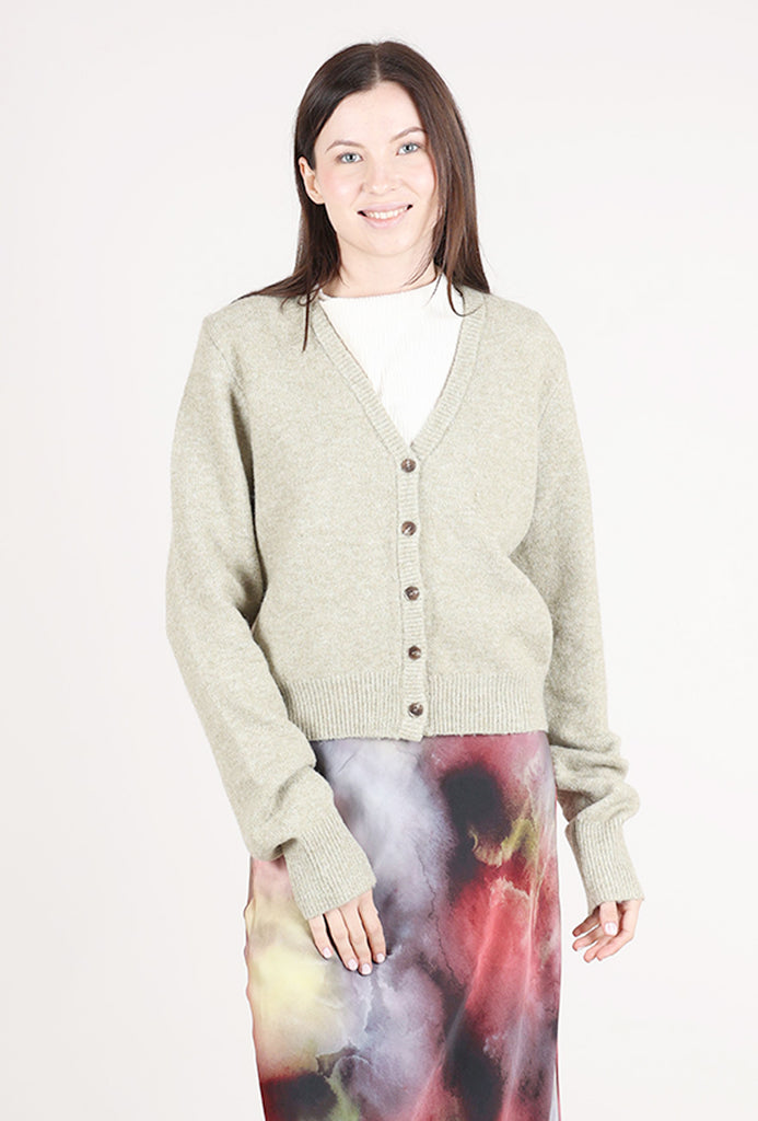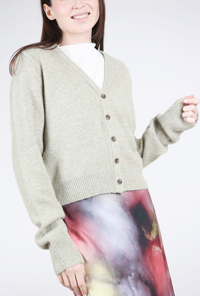 Densely knit in a soft, substantial blend, this grandpa-style cardigan has a deep V neckline and a button-front placket. The sleeves are extra long and the body is slightly cropped, hitting at the high hip on most wearers.