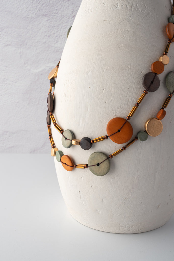 The Rust Cerelia Splendor Necklace is a stunning fusion of rustic charm and elegant sophistication. Rich rust-toned round wood beads are beautifully separated by gleaming bronze bugle beads, creating a rhythmic pattern that catches the light with every movement. Strung on an adjustable brown wax cord, this lightweight statement piece offers both visual impact and comfortable, customizable wear that complements any style.