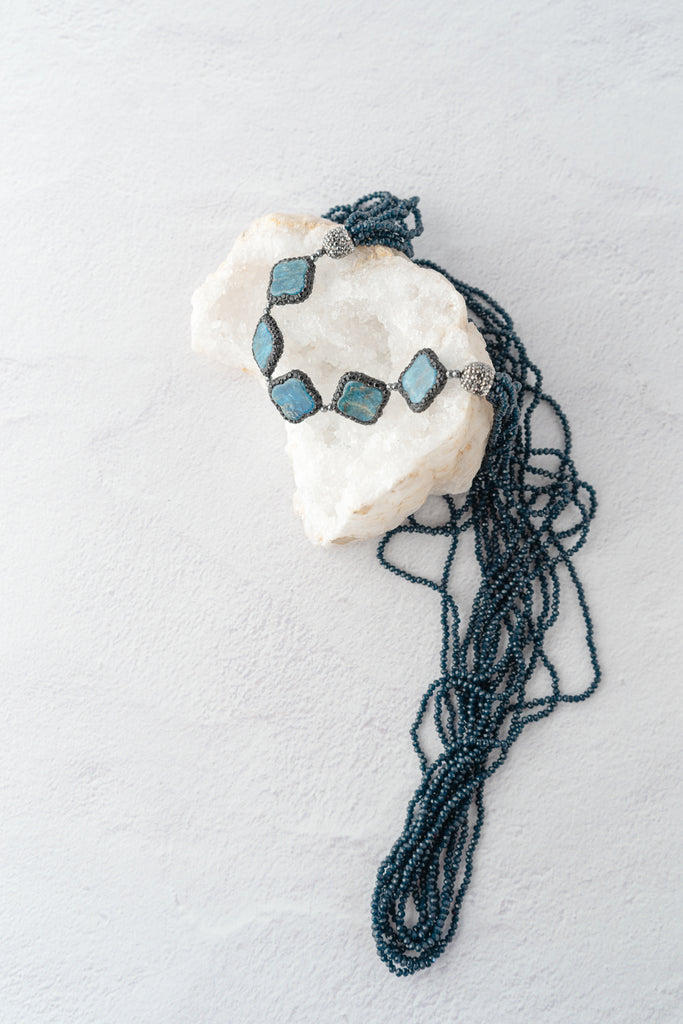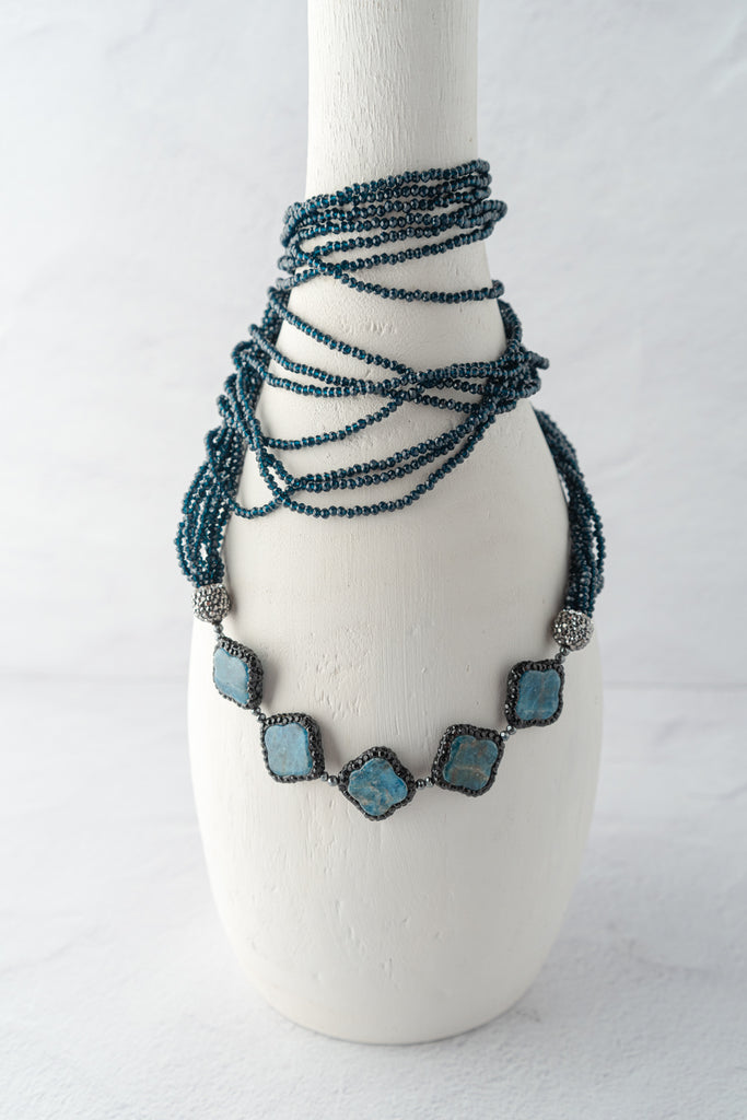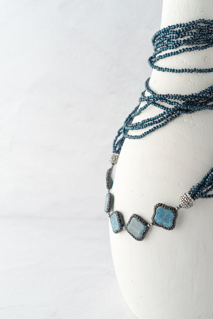 This striking multi-strand necklace features layers of faceted blue beads accented by five cushion-cut stones framed in pavé detailing. The layered design creates a statement look with beautiful texture and shimmer, perfect for adding depth and color to any ensemble.