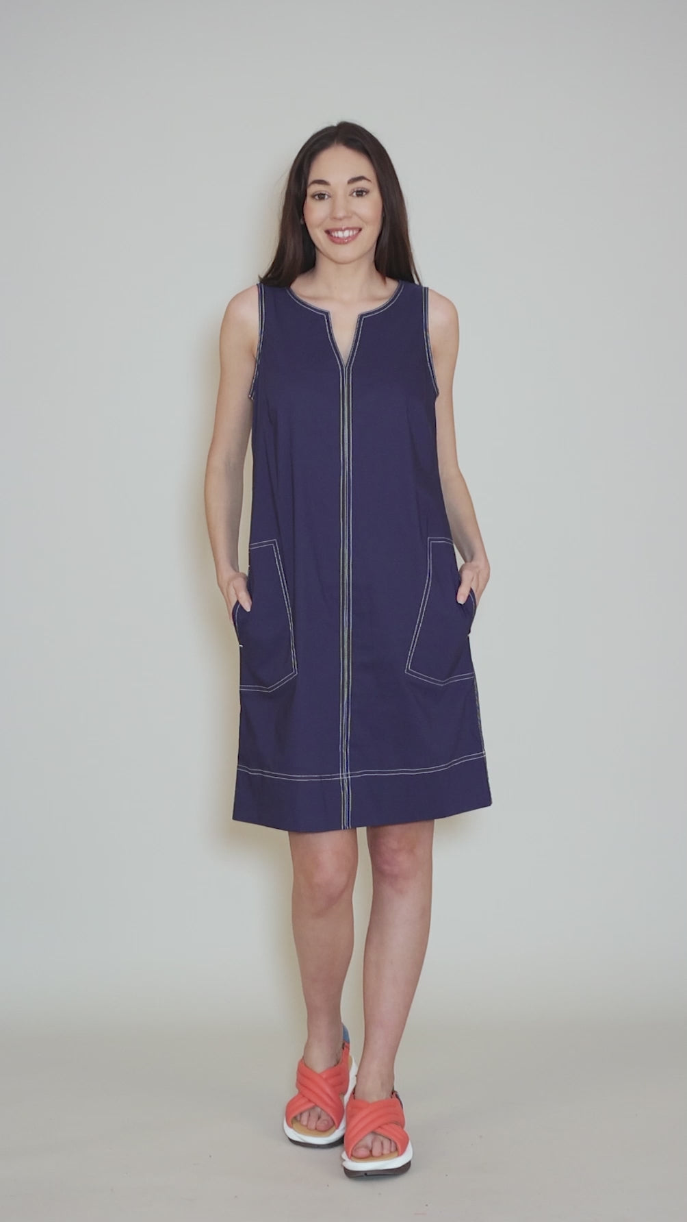Pack this woven cotton dress for your upcoming beach trips! It has a simple shift silhouette, with a slit detail at the rounded neckline and pockets on the hips. Contrast stitch details add to the vacation vibe. Running true to size to slightly small.