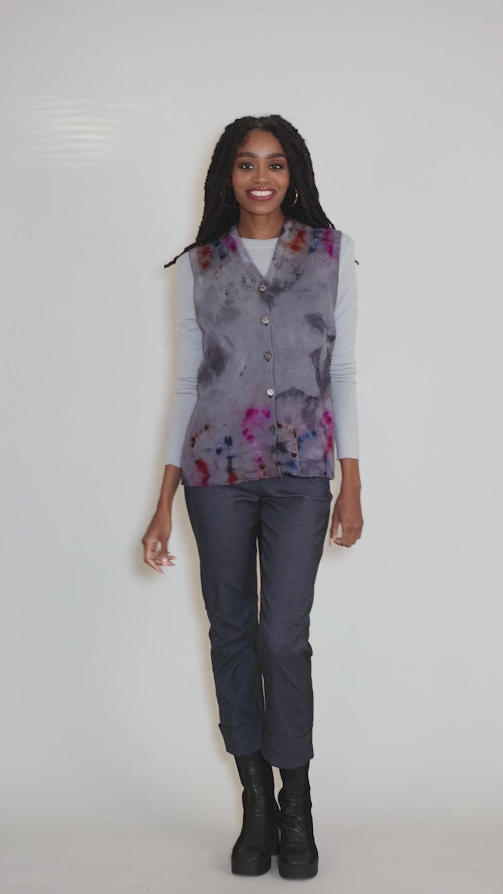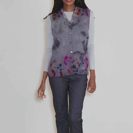 We're loving this new style from Galadriel Mattei! Hand-dyed and hand-finished by the artist in Los Angeles, this not-too-oversized sweater vest is make in a luscious, recycled cashmere. It has a V neckline, with a button-front placket and deep armholes for easy layering.