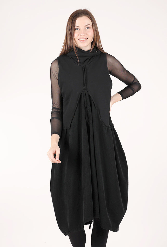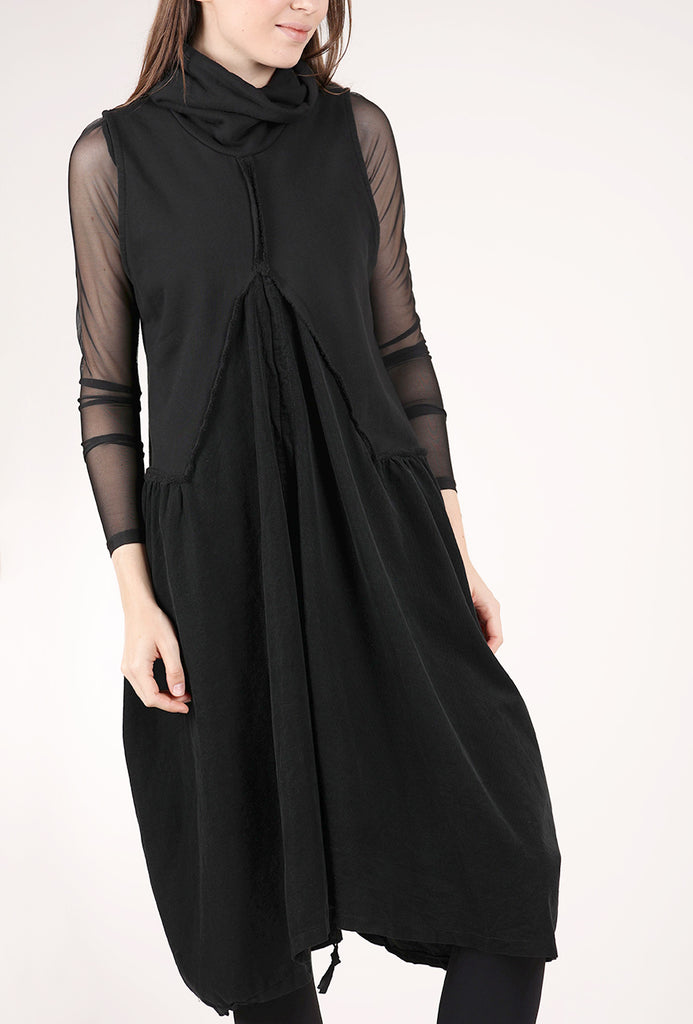 There's a lot of style for the dollar in this sleeveless dress! It combines a substantial sweatshirt knit with an inset of soft cotton corduroy. It has a draped funnel neckline, with dimensional seaming and a lantern-shaped silhouette. A drawstring detail at the hemline allows for customized cinching in front.