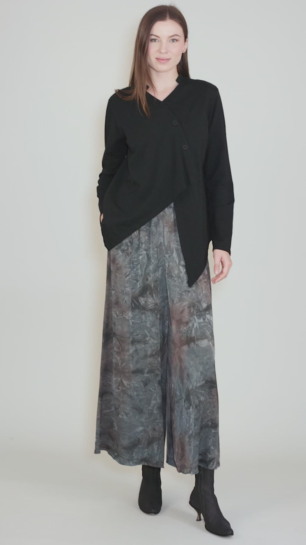 This little number has the stylings of Euro-cool blazer, but one with all the comfort of a sweatshirt. It's made in a mid-weight cotton jersey, with a set-in shoulder, long sleeves and an off-center, asymmetric button placket. The hemline is also asymmetric.