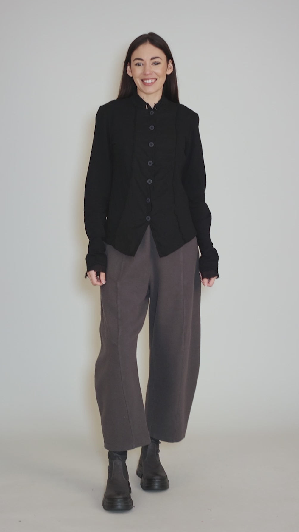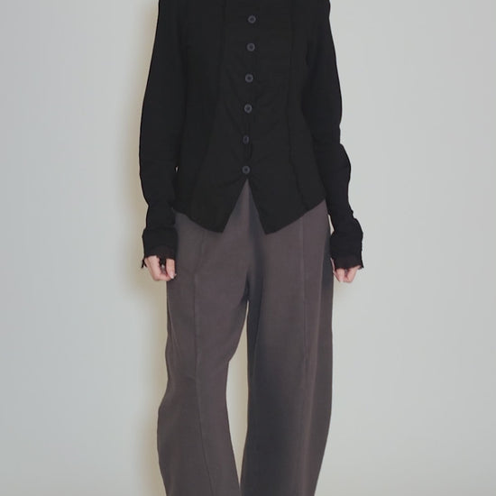 This close-fitting jacket is done in a combination of fabrics, a stretchy knit jersey with lightweight woven cotton accents throughout. This jacket has a soft collar and a button-front placket, with a set-in shoulder and extra-long sleeves with tattered poplin trim. We find this is running on the small side.
