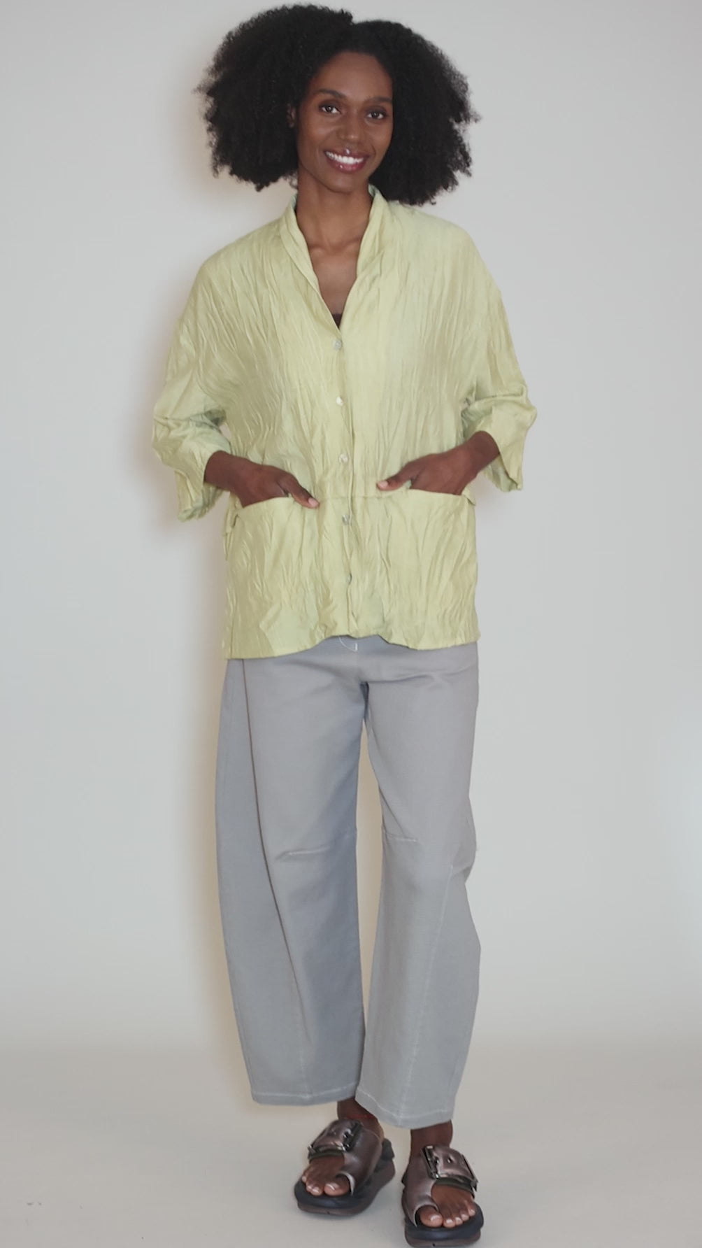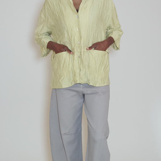 Made in a refined, crinkled woven viscose blend, this piece is all about relaxed ease. It has a button-front placket, a drop-shoulder construction and three-quarter-length sleeves. The body is deliberately boxy, with a pleat detail at the waistline that sets up seamed pockets. Running quite large.