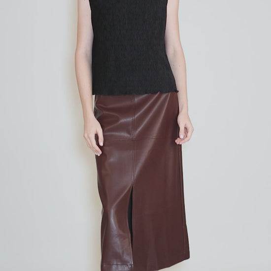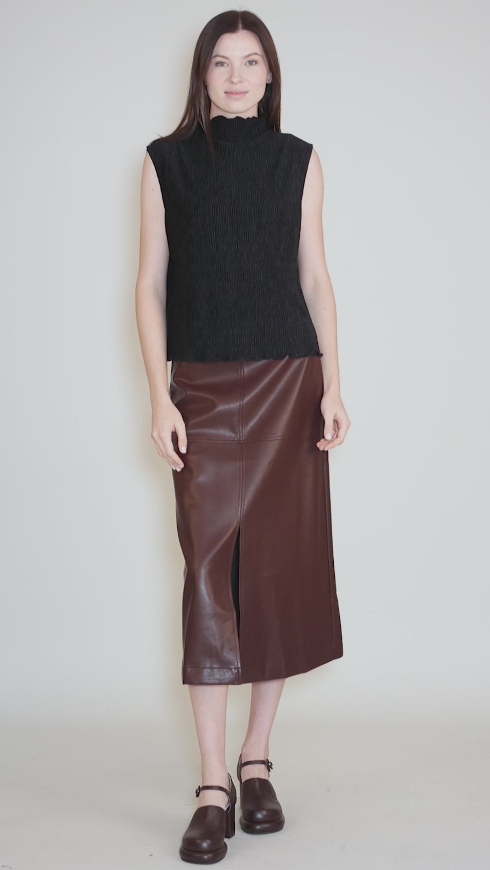 Such a great layering piece! Made in a lightly crinkled velvety blend, this sleeveless piece has a lettuce-edged funnel neckline and a straight silhouette. A hip-skimming length adds to its versatility.